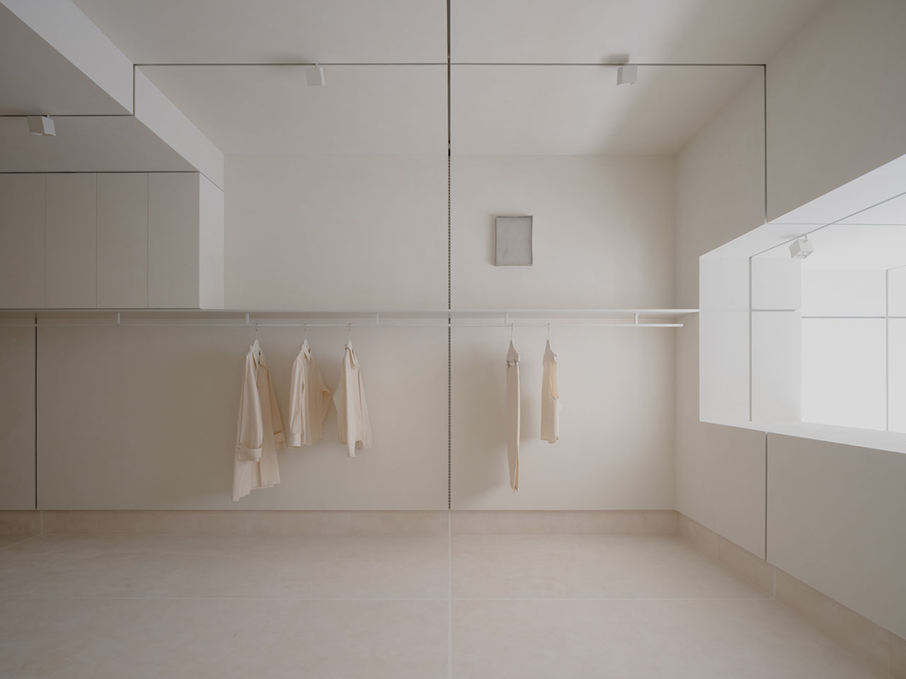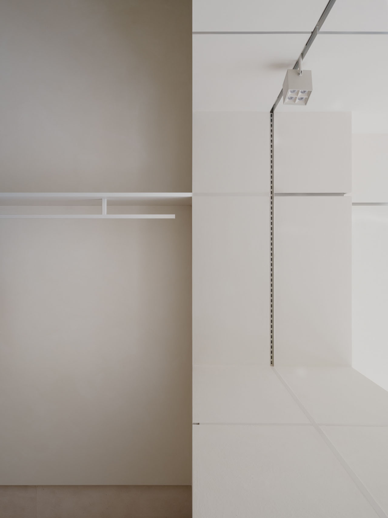 建造以“脱模”的手法揭示结构本身,空间仿佛一块刚揭开的盒装豆腐,保留着模具痕迹。墙体呈现出模块拼接的规律,构成独特的空间语言。筋的结构组织着、激活着空间。垂直的“筋”沿着中心轴线展开,成为灯轨与立式展示轨道。水平的“筋”则呼应场地的窗台高度。上缘界定了挂架、壁柜与挂杆轨道的位置,下缘则成为踢脚的沉积线。每一条“筋”都以垂直交织谱写着秩序,以无感的方式将功能嵌入空间的缝隙之中。