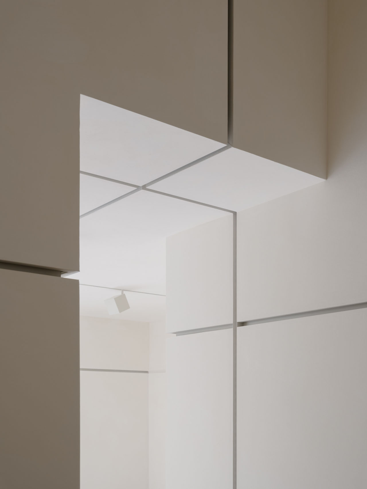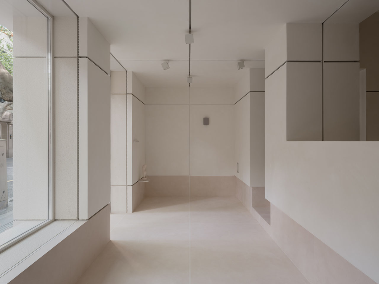 去物质化是削弱物之形体,强调抽象关系与逻辑结构的重要存在。像豆腐一样洁净而克制,为材质在空间中相遇创造了合理性。室内空间以细腻的米白色肌理漆呼应豆腐的质感,触感温润,米白色莱姆石地面中镶嵌的人造石延续着结构筋的路径。功能性的金属“筋”勾勒着实用的边界。材质色彩与肌理差别甚微却统一着空间,克制的色彩与留白让空间呼吸,制造时间与空间的停顿,赋予空间悬置之美。