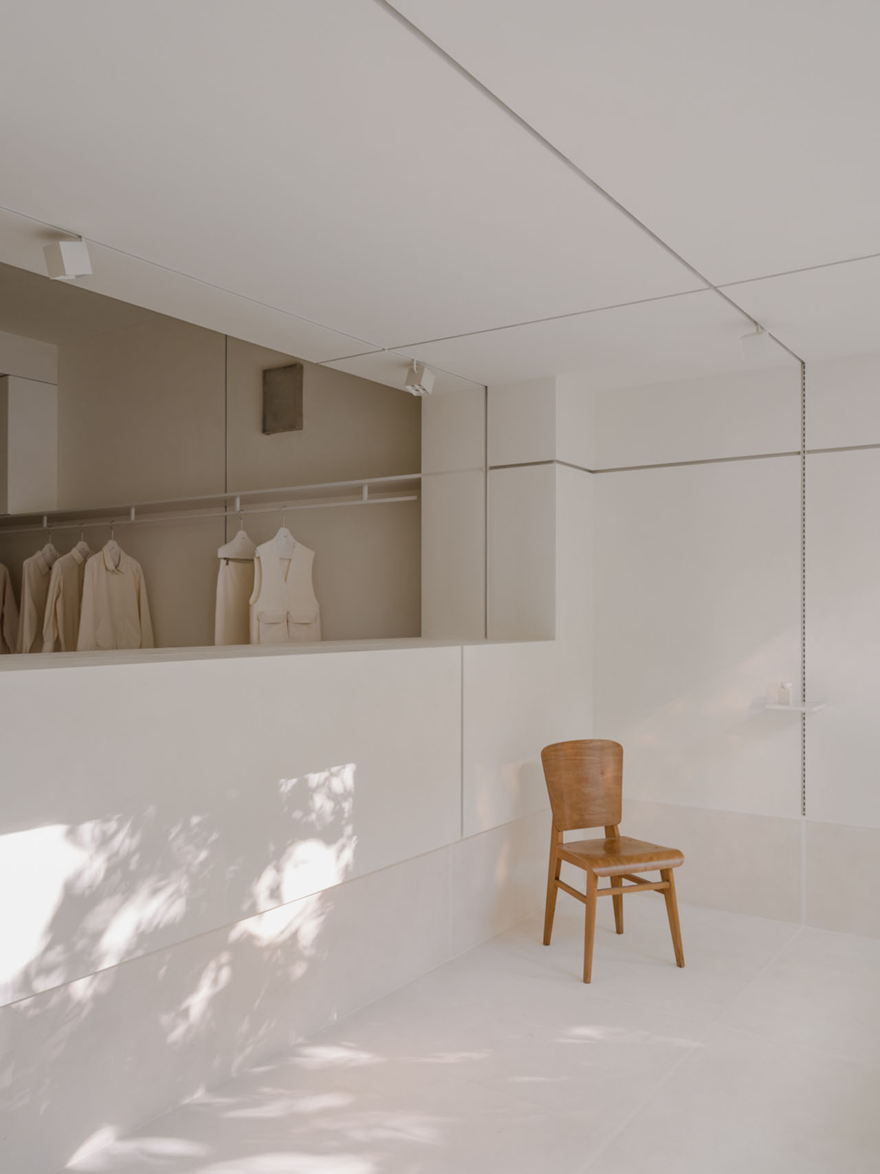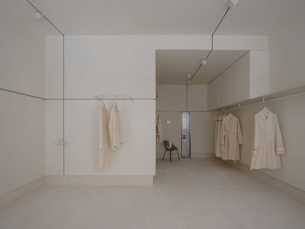 空间让toutche 品牌的核心表达更为立体,它不仅是服装的集合,更是一个兼容矛盾、承载情绪、弱化边界的“关系系统”。无关装饰,而是形式与功能的语法。一系列功能部件围绕墙面“筋”系统运应而生:承载物件的展陈平台、悬挂画作的挂钩、展示衣物的挂架。每一条“筋”的衔接都既务实又具表现力,共筑出一个容纳物品、空间与人共生的空间。正如品牌的“原型”概念服装一般,室内细节同样克制而持久,以简洁的结构承载着复杂性,在不显眼处藏下千钧分寸,让生活的逻辑自然嵌入材质与结构之间,在体系中感知自由。