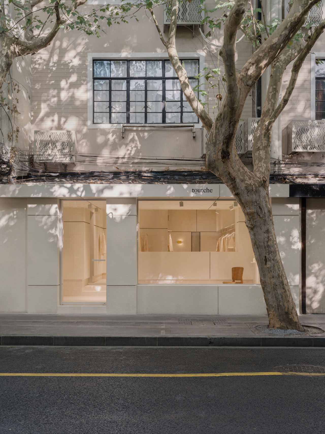toutche的首家店铺静置于梧桐之阴,在这里,品牌哲学成为城市肌理的一部分。店面尺度不大,直面街道,却在有限空间中沉淀出 toutche 的“原型语言”。空间回到最初的逻辑形态,抽象不规则场地为几何框架,以简洁的结构构筑可久居日常。柔软如豆腐,扎实可塑,结构却恒久。