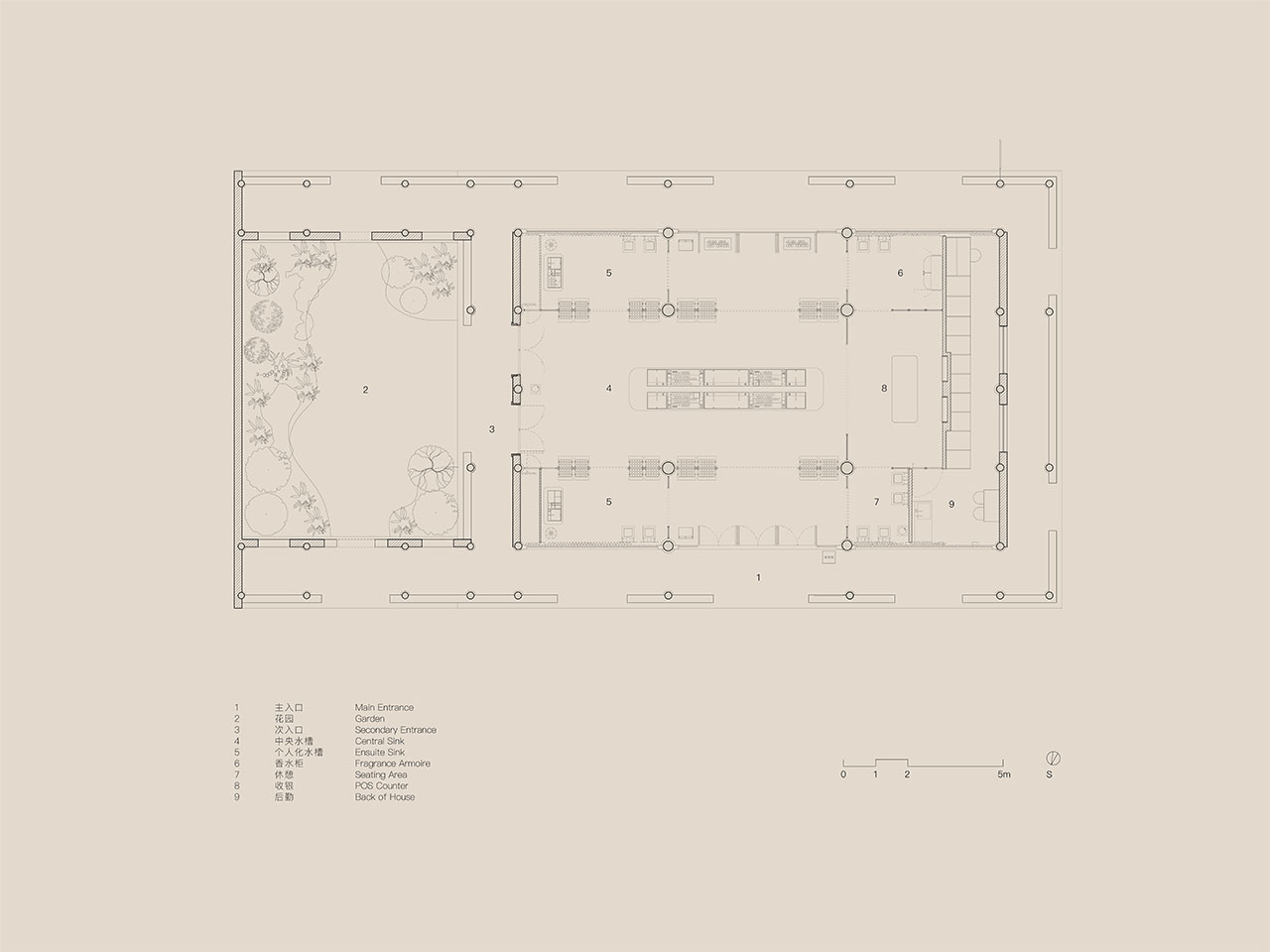 产品架与“罩”结合,跟随建筑的梁柱位置置入,满足功能需求的同时自然形成了空间层次和体验动线——临街的南立面敞开六个门扇,成为主入口,欢迎客人的到访;山墙的次入口分散人流的同时,将侧园树影婆娑、流水泠泠的景致引入室内;标志性的中央水槽是伊索空间的核心,被放置于中心的“厅”内,宽敞的空间能让访客在此安心试用产品,自在交流;个人化水槽、香水柜、休憩等功能则被放置在四周的“室”中,为访客提供专属而熨帖的个人化服务。