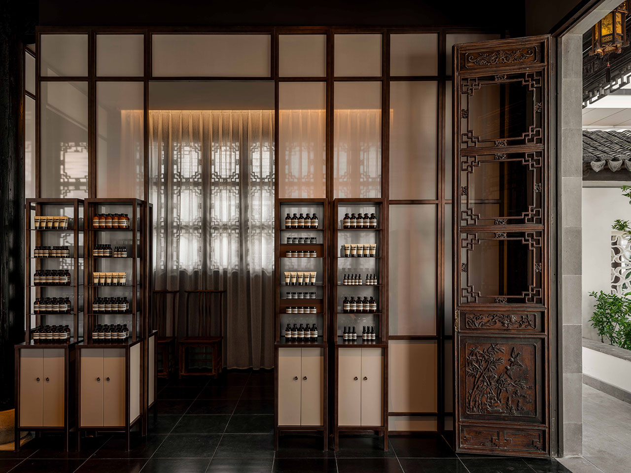 设计的核心在于,在传统建筑之下,重新定义空间,融入现代功能的同时为伊索营造一个具有独特品牌氛围的空间体验。受传统园林建筑的启发,空间分隔的形式灵感来源于“罩”,这一典型园林室内构件将空间划分为核心的“厅”与四周的“室”——“厅”是开放的,承载了社交属性,也兼具一定的仪式感;“室”则更多意味着包裹性的私密体验。这两种空间属性与伊索的空间需求不谋而合。