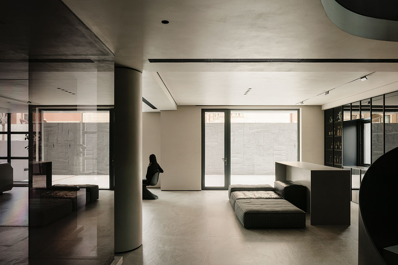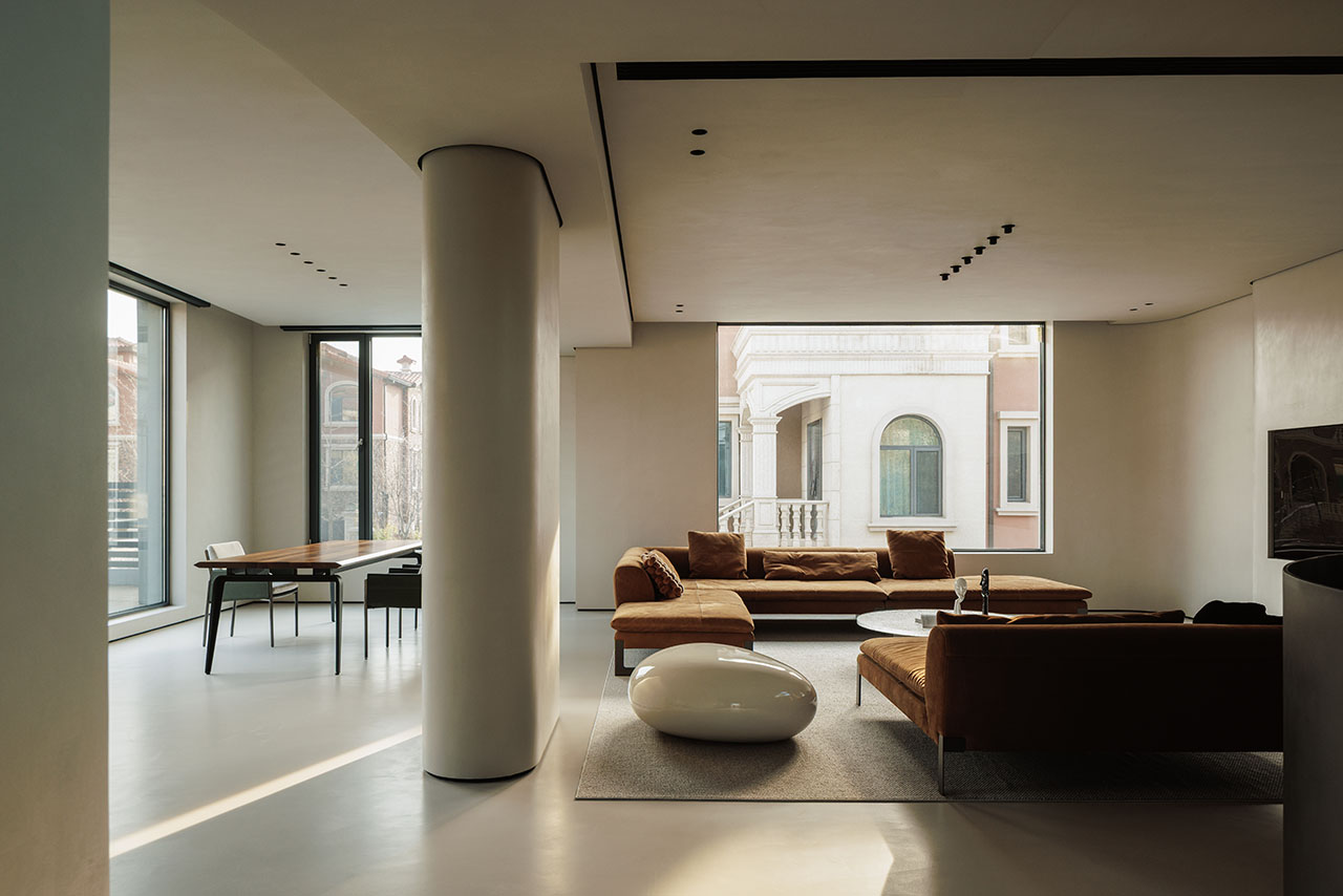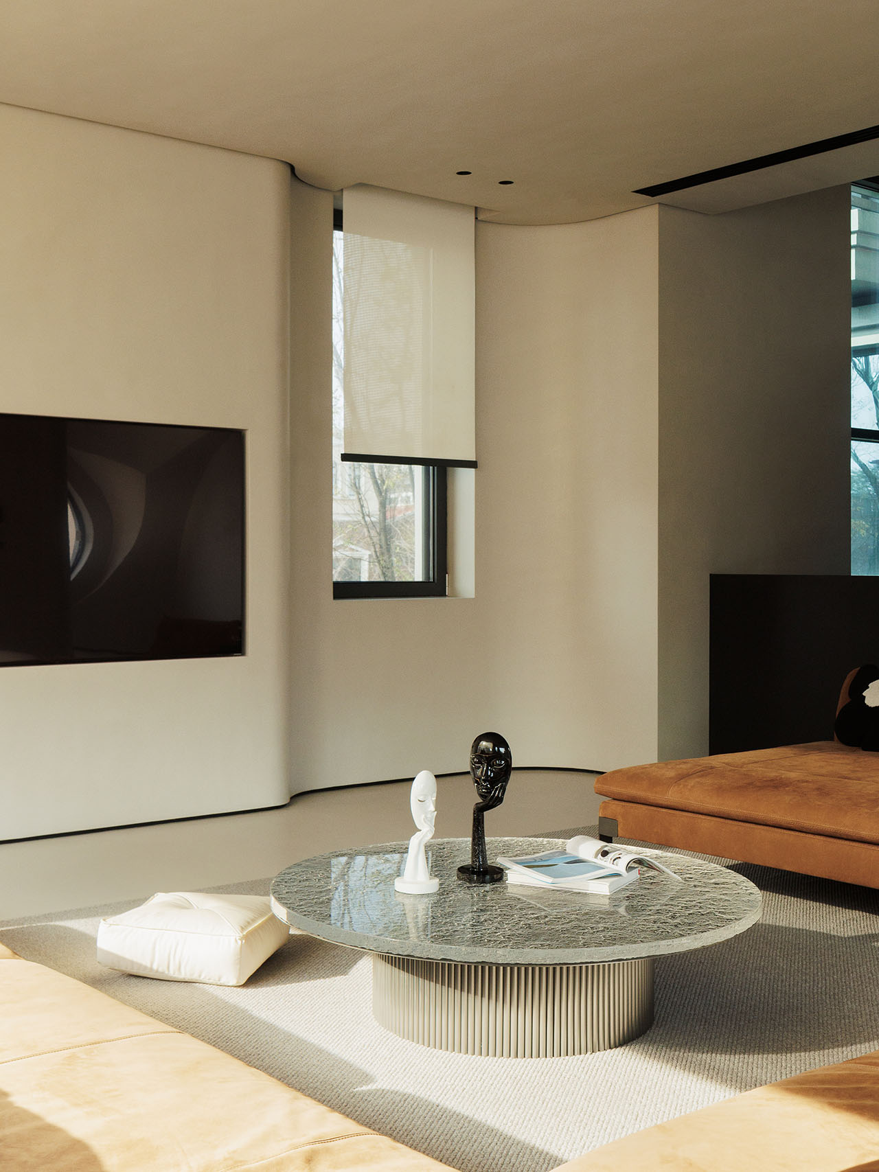 线性透视在微水泥延伸中悄然铺展,弧形柱柔化边界,天光穿窗而入,开放不空旷,极简有温度。
