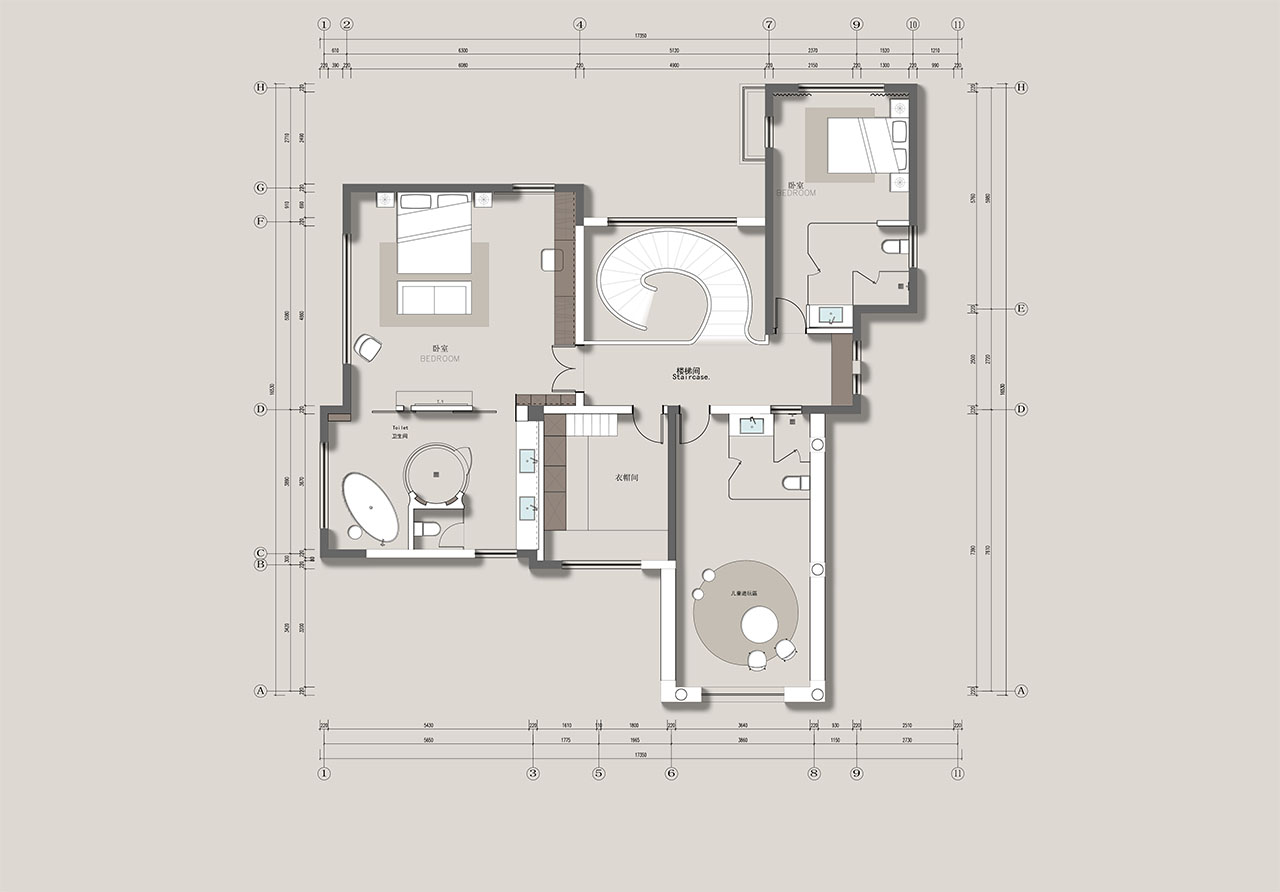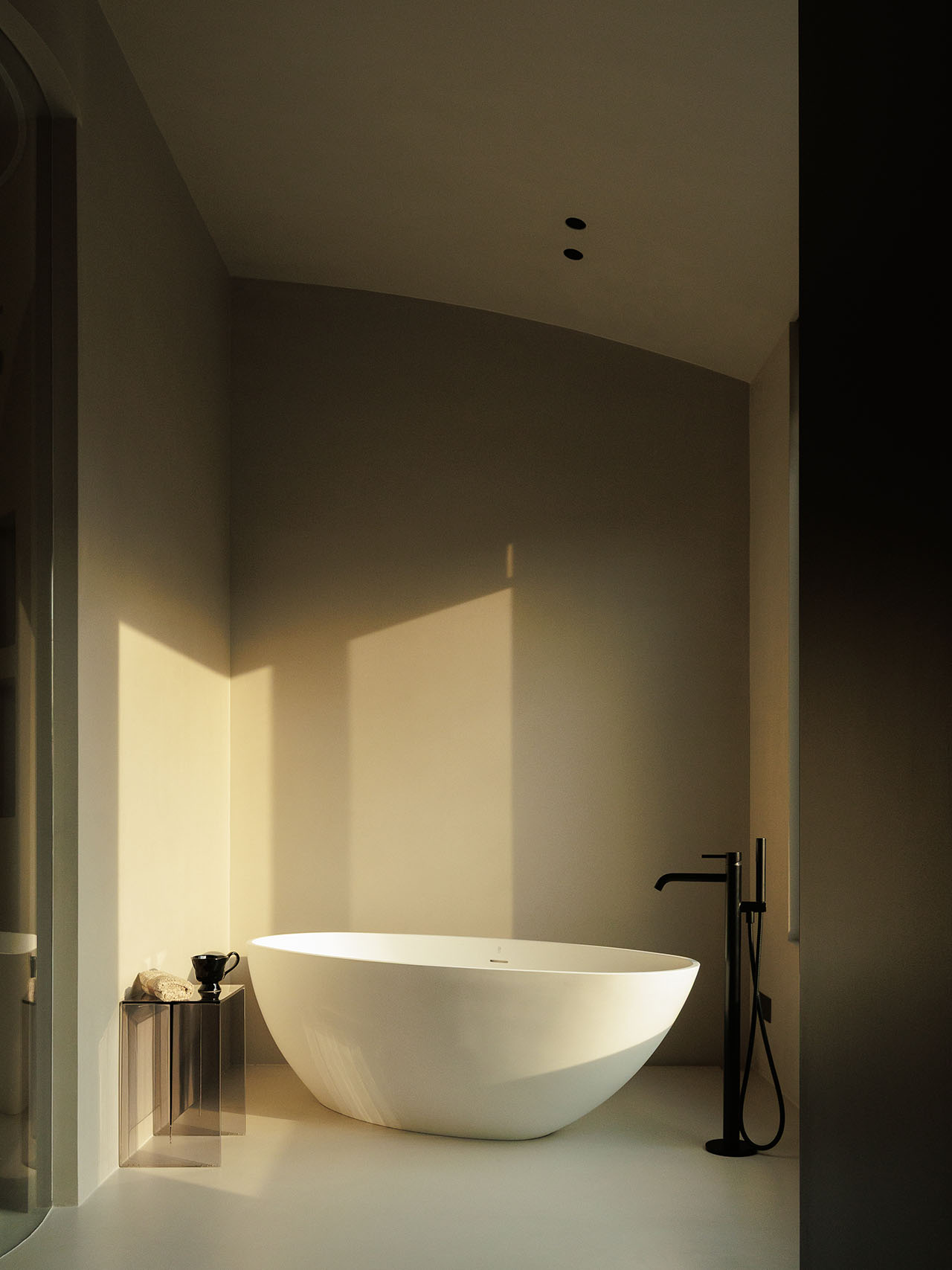 与主卧不同,主卫不再需要用阴影缝勾勒边界,墙、地、顶无接缝处理消弭物理边界,既强化空间整体性,又减少卫生死角,适配卫浴场景的实用需求。圆形淋浴区像是主卫的中心舞台,挣脱传统卫浴的矩形桎梏,玻璃隔断又界定干湿功能区。独立浴缸临窗布局,既借自然光提升空间通透度,又通过玻璃隔断实现干湿分区的功能划分。