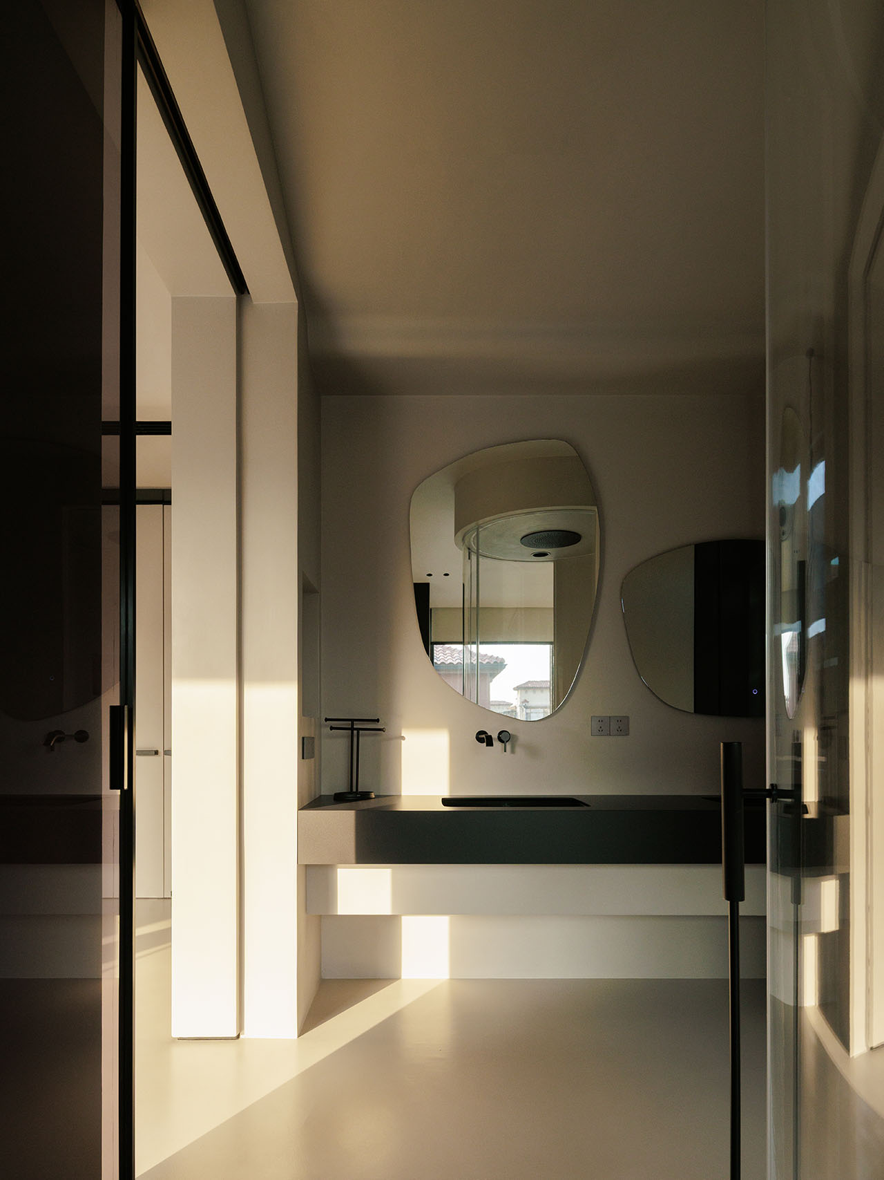 不规则艺术镜肆意生长,与从天而降的水滴龙头碰撞出高级张力,双台盆缓解晨起时夫妻二人共用洗漱台的压力。