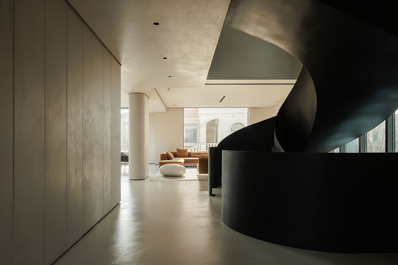 微水泥营造 “无边界” 的极简基底,哑光肌理让空间更显纯粹。黑色螺旋楼梯竖向延伸,拉开空间视觉层次,弧形立柱与曲线楼梯形成 “流动的结构对话”,从硬装层面打破直线的刻板惯性。