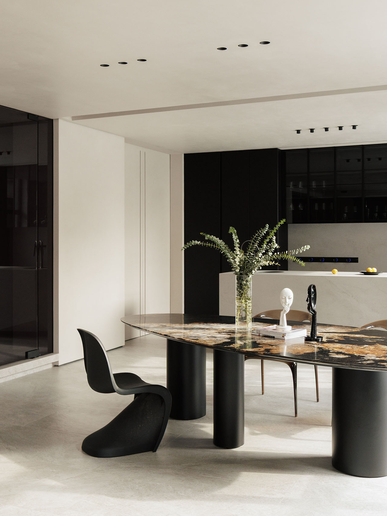 开放式餐厨布局,消弭厨房与餐厅的物理边界,构建家人互动的流畅动线。白色岛台界定厨房操作区,异形大理石餐桌作为视觉核心,搭配标志性曲线椅,在大窗引景的通透感中,让用餐与烹饪的日常,成为材质碰撞与艺术布局共生的美学体验。