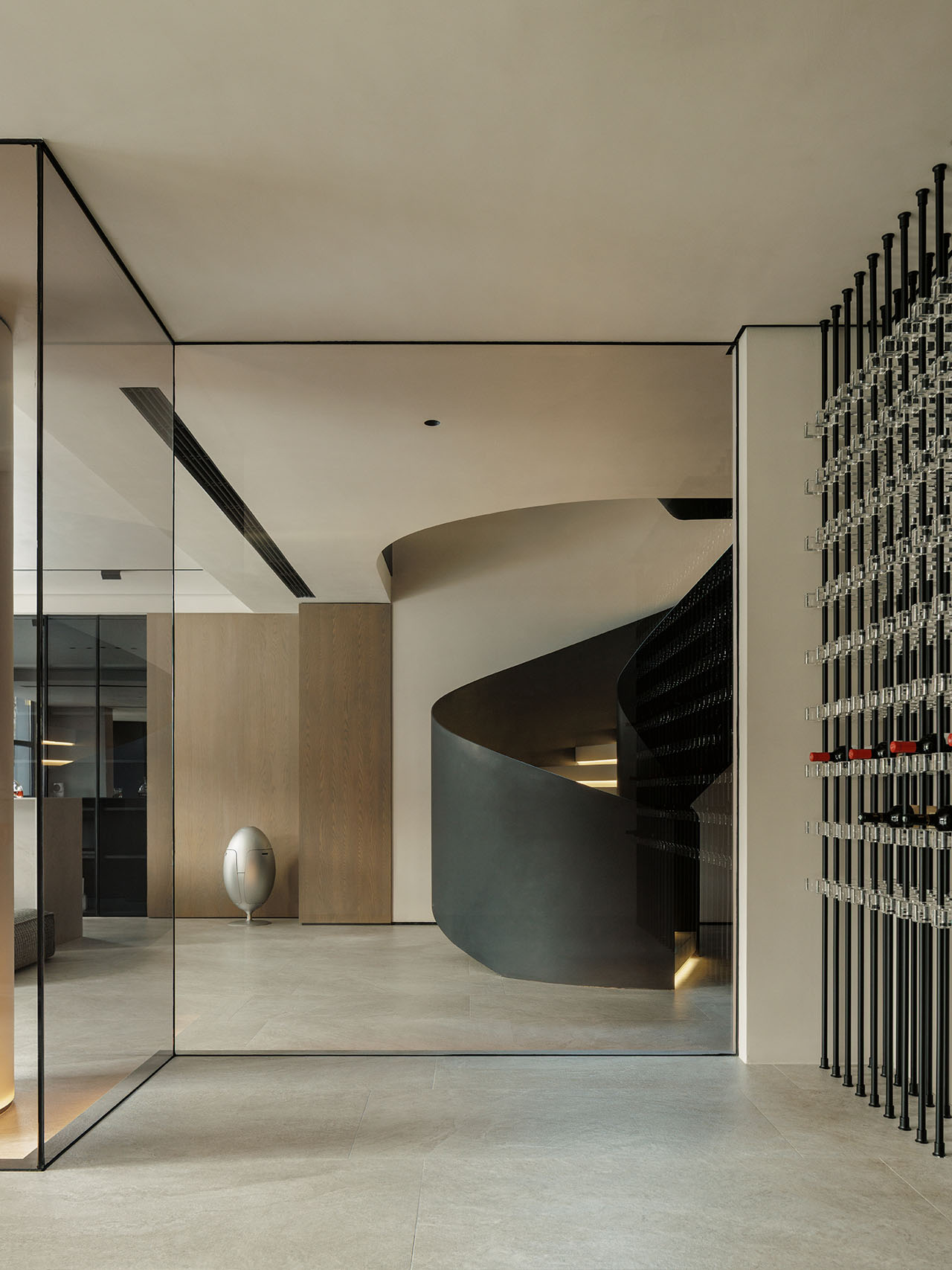 从地下室酒窖望去,玻璃隔断通透显界,酒架如水晶装置,黑色螺旋楼梯旋入上层。