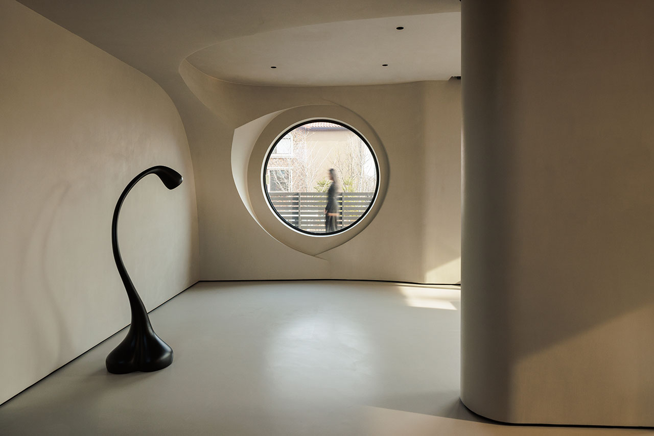 弧形墙消解棱角,“舷窗式” 窗洞打破直线的刻板,与圆柱形结构柱形成 “柔与刚” 的对话将 “建筑装置思维” 融入居住空间。