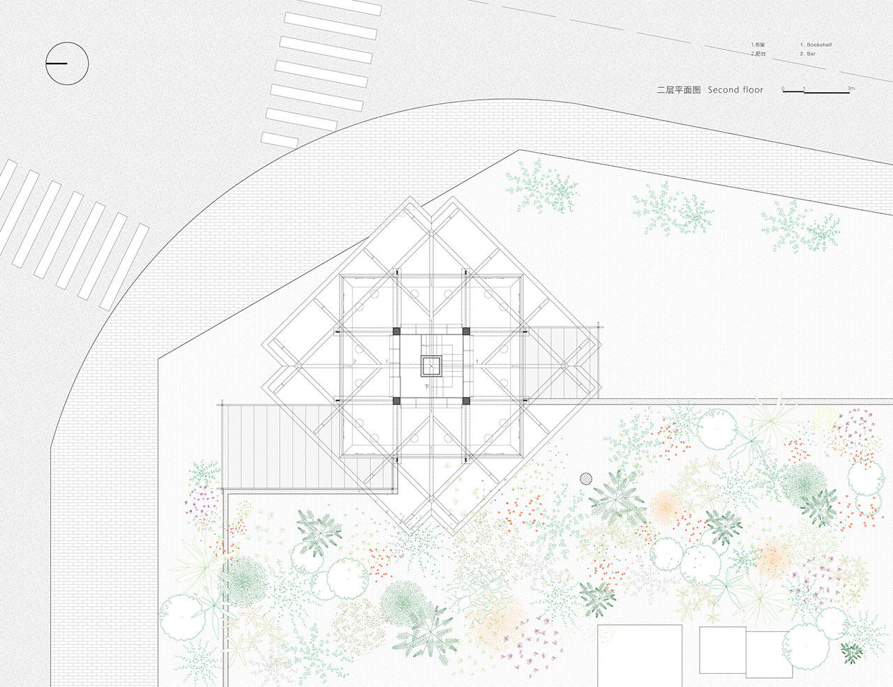 建筑南北两侧各增加1个户外平台区,分别满足咖啡售卖及书店、园区定期举办活动。