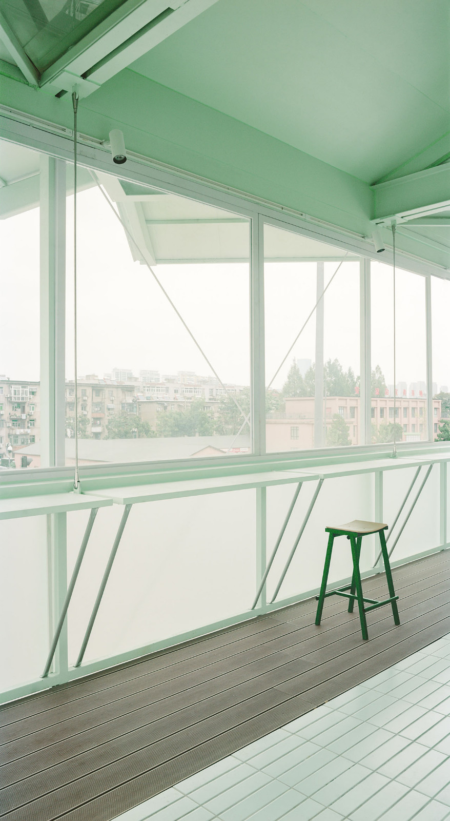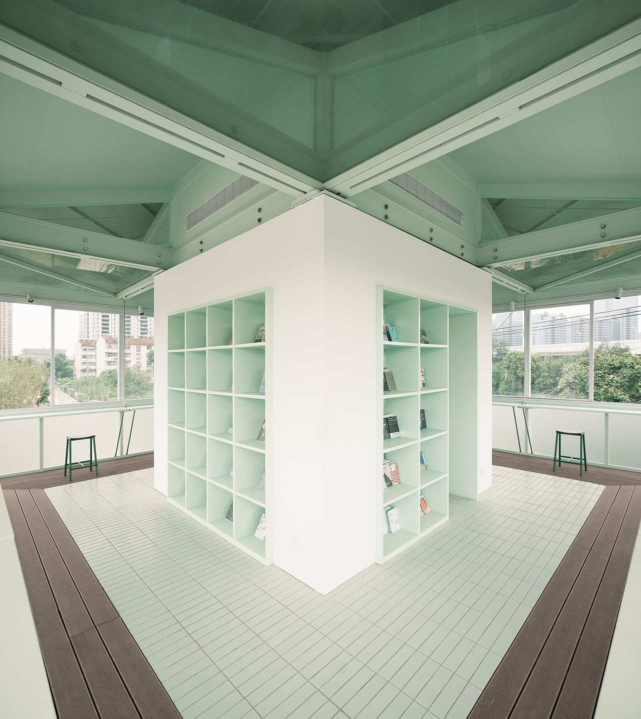 建筑四个角的位置设置了可开启的移窗,打开后形成无遮挡视野。原始楼梯加固后用石膏板围合成室内管井,外侧作为书店留言墙。