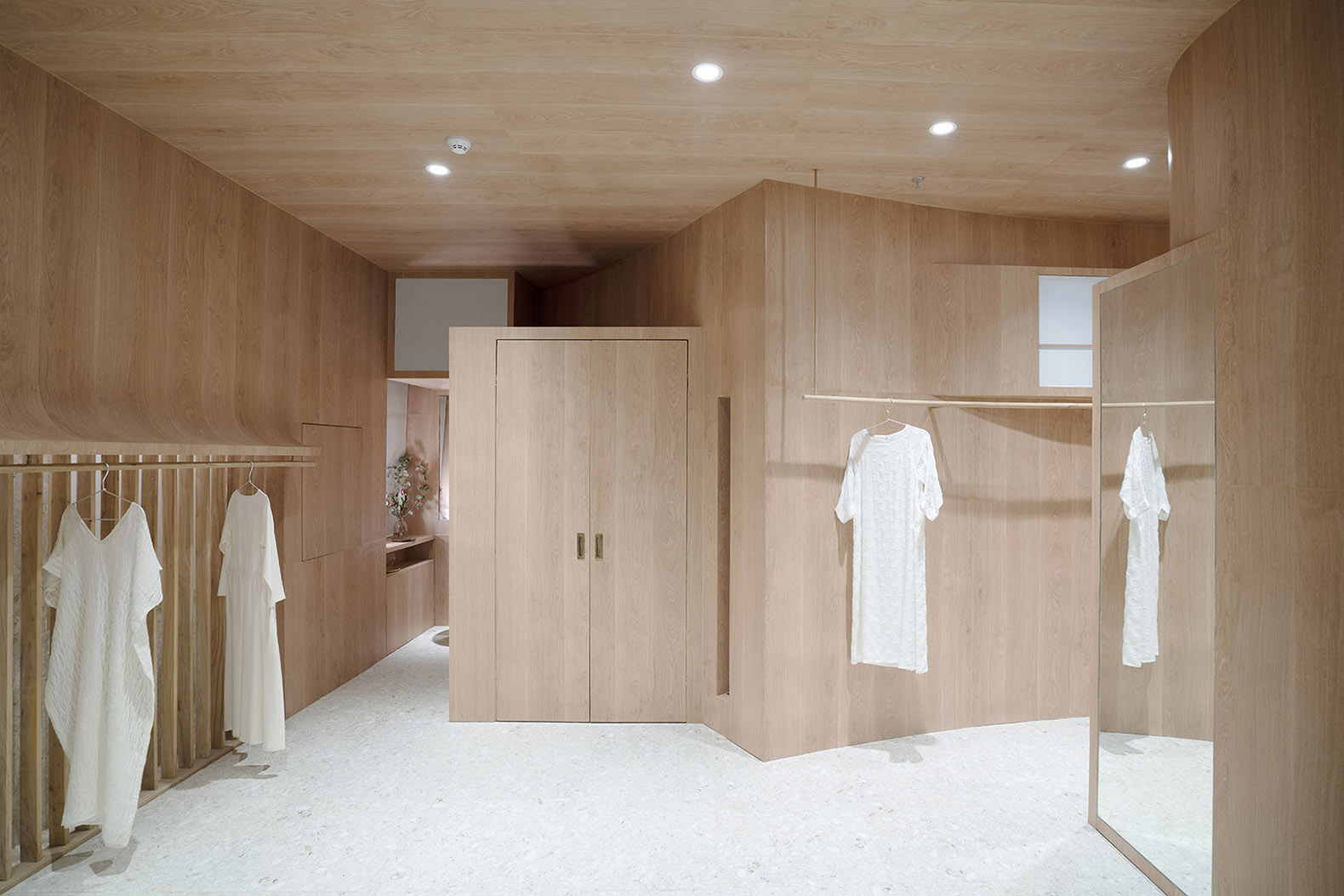 展示区域被“空间的裙摆”笼罩,以加强它自身的整体性,墙身上部分下沿卷起,露出下半部分的格栅,像少女掀起裙角,它也是服装展示的背景。