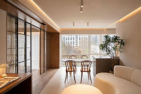 整个空间在功能上依据使用需求,分为五个部分:服装工作间、会客茶歇、盥洗区、试衣间、主展示区。