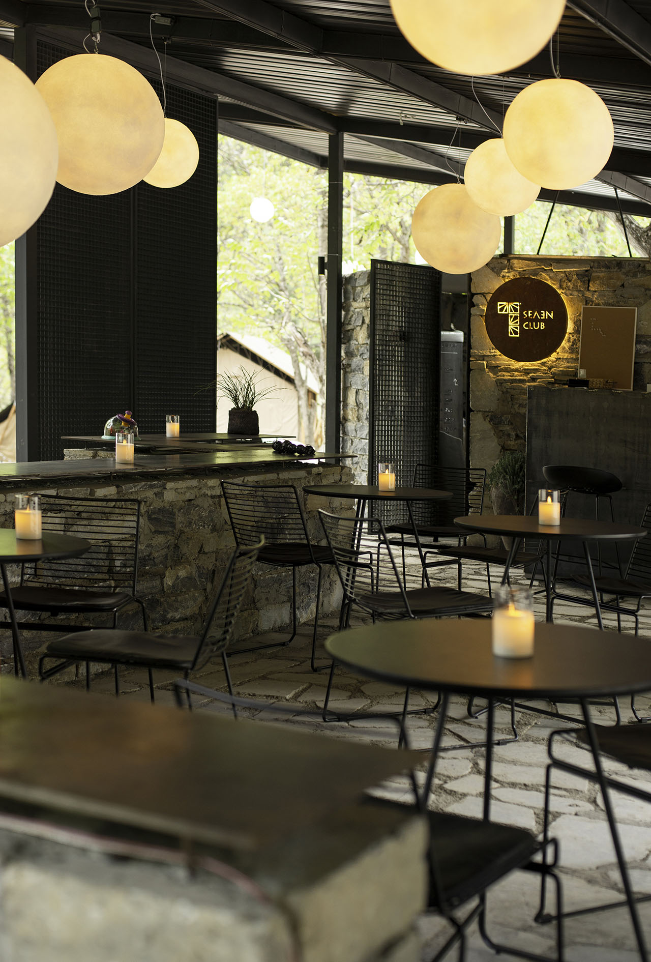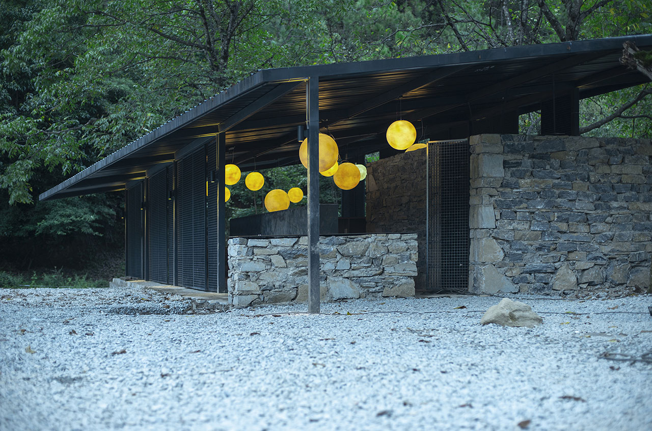 林里亭采用钢结构建造,梁柱结构施以重色,力求纤细清晰;地台长桌及房间墙体则用现场石块就地砌筑,不择形色,粗犷质朴。