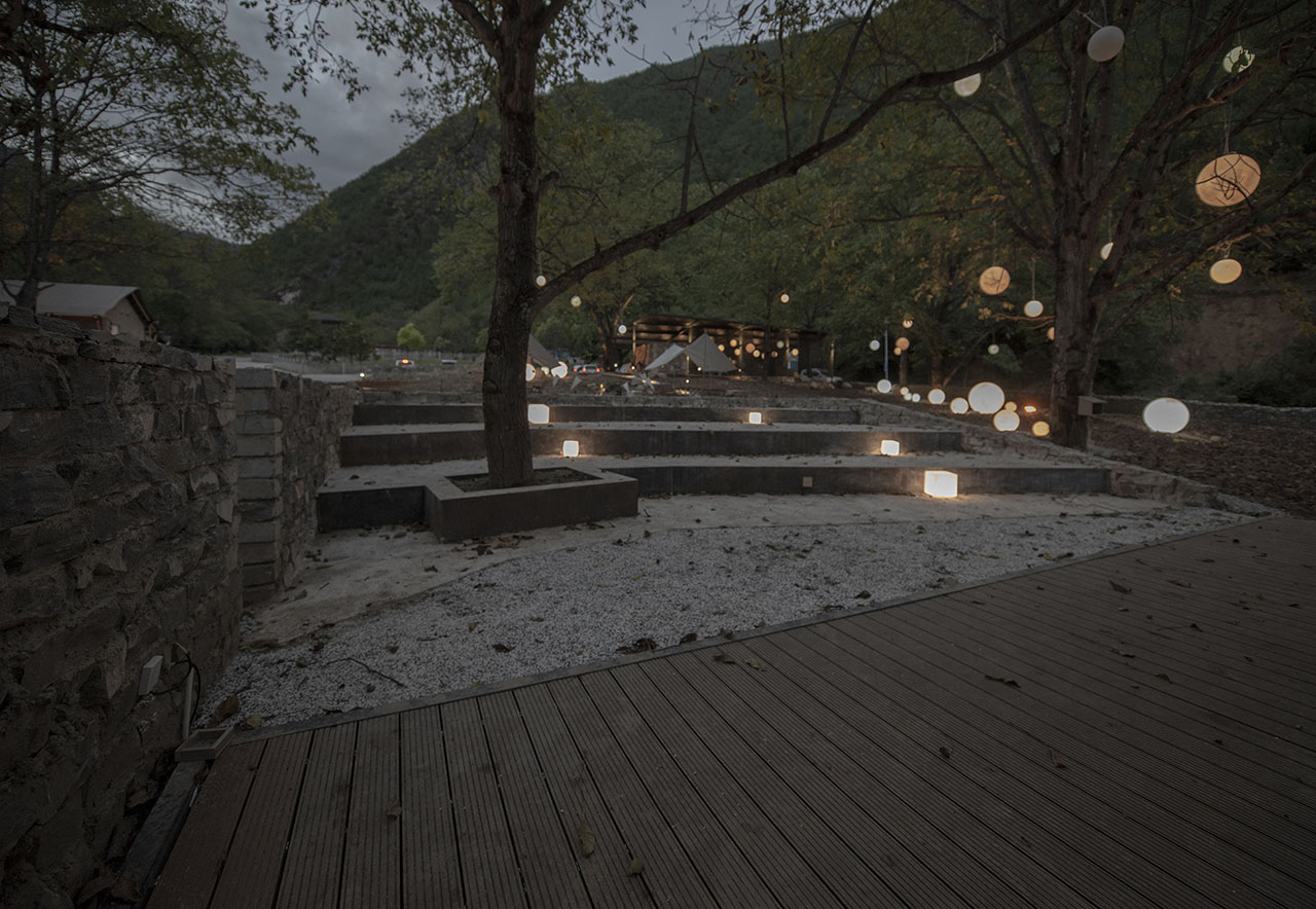 委托方希望在国家公园入口处的场地建设帐篷营地,并设置满足休闲住宿的服务设施,供人亲近自然,留宿林间;建筑师的设计策略是最小限度的干预自然,将可收起的住宿帐篷依势错落,临溪布局,以求各自观溪,枕水而眠;与此同时,建筑师以极为克制的设计手法,仅新筑两处方亭,以满足必要的接待和餐饮需求。