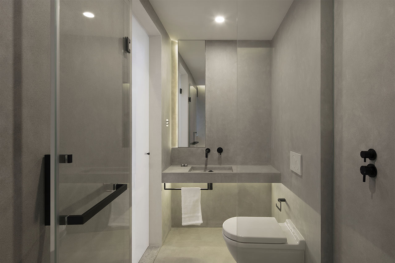 在传统的星级酒店中,客房部分通常统一设计为彼此封闭的环境。我们想要打破这种封闭的氛围,所以在房间立面设计了大面积的落地玻璃,并将客房内看书、座谈等相对公共的功能区布置在窗边。这样除了增加采光,不同客房的客人可以互相看到彼此,进行某种程度的交流。而在房间内侧或墙体后面,安排了就寝空间、卫生间和浴室,保证了生活的私密性。