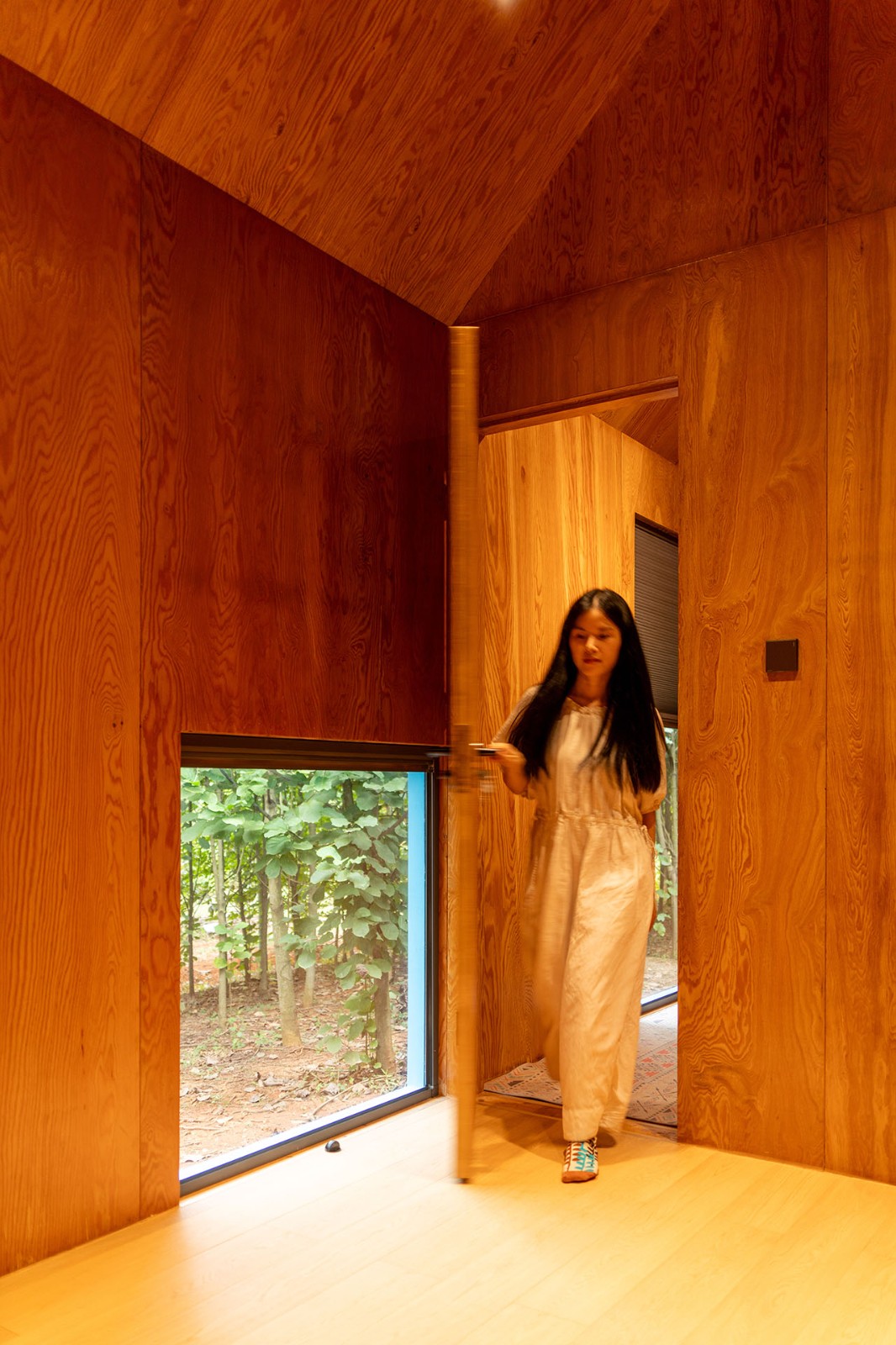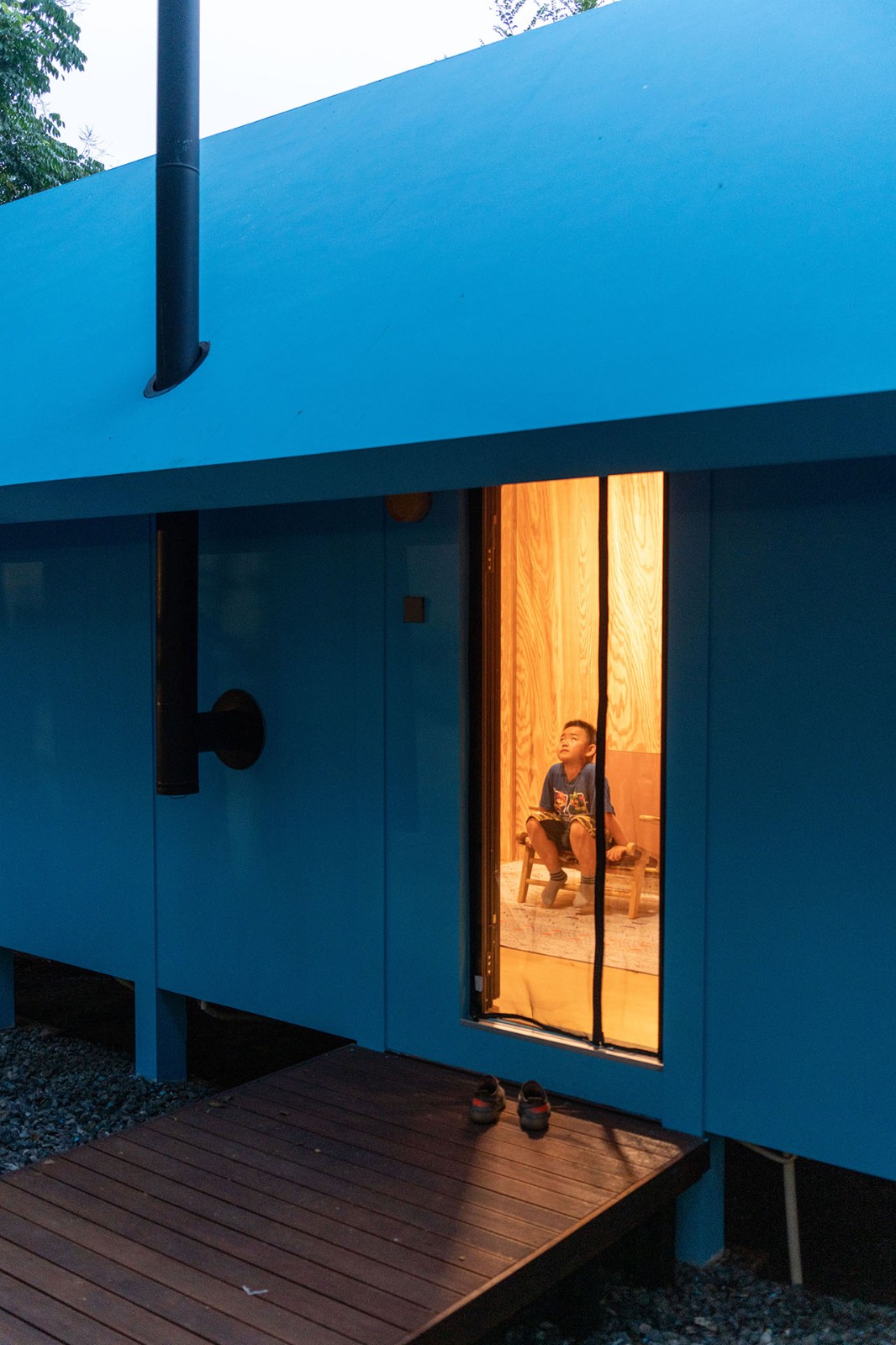 建筑的整体采用胶合木结构,通过数字化技术对每一根异形构件和节点进行设计定制,实现了百分之百的全装配建造。业主艺术家的身份,让我们最终决定把这栋房子理解成是自然里一件纯粹的展品,一件木质拼装的蓝色容器。关于居住,一定没有标准答案,每个人都希望居所能够传达自身对于生活的理解,或许在艺术家的眼中,荒野之家也是她艺术观念的一部分。入口一侧,木屋只有一盏圆灯和入户门的灯光,室内的每个房间分别有望向森林的窗户。