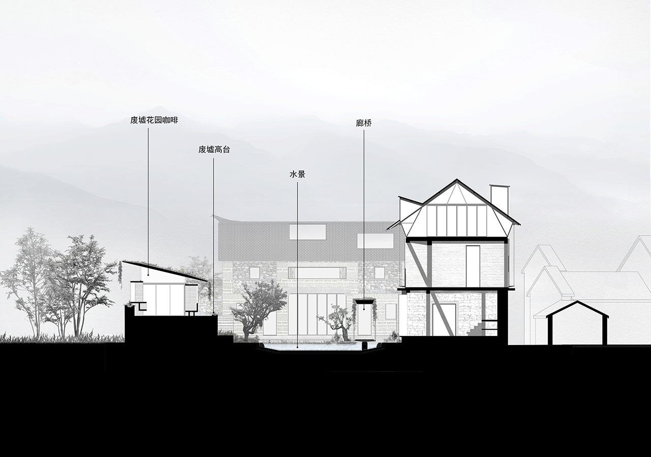 游园体验最终在高台之上废墟花园咖啡里或眺望远山、或回望内院的片刻落下帷幕。一期石屋和北楼孤立的建筑体验,终于在身体的游走、停留、凝视、爬阶、远眺、回望等游园动作中,以及室内与园林相互渗透、相互交织的模糊边界下,被重新编织成一个整体的场所体验。