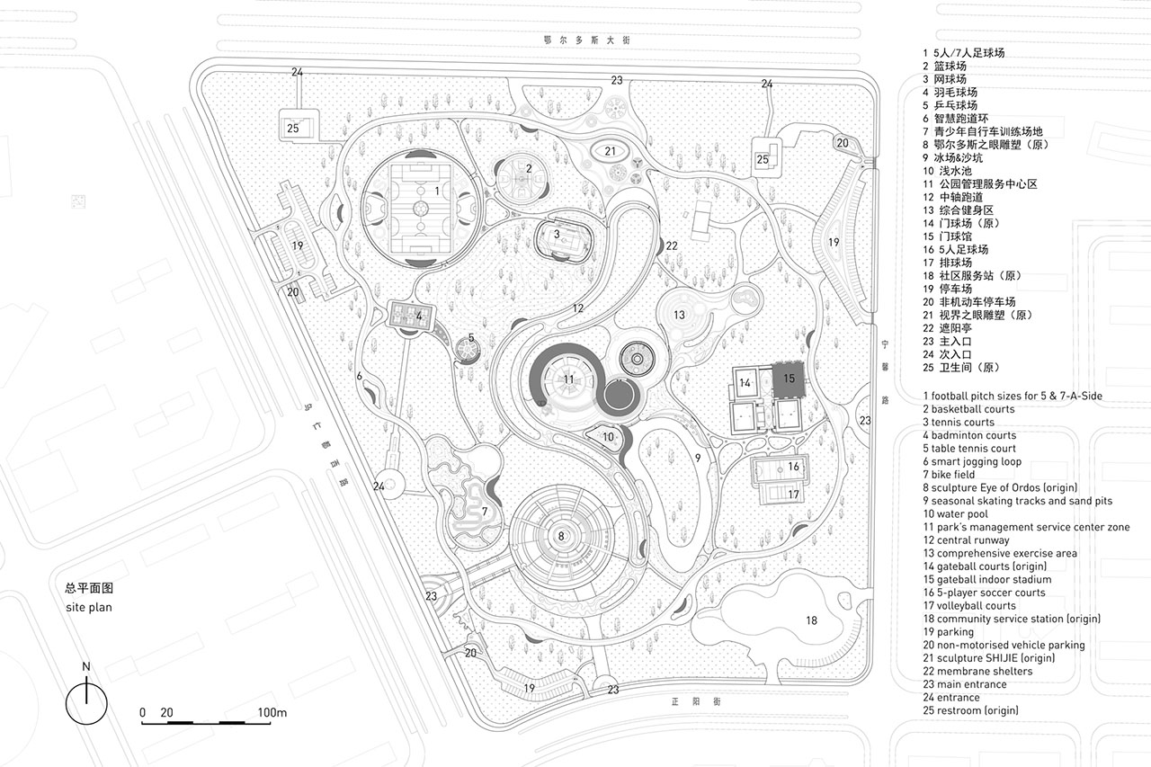 源自地方景观的概念生成了公园的空间布局和交通环线。设计首先以环状“河流”跑步道理清整片场地,蓝色的步道配色既是鄂尔多斯高原的蓝天,也是河流中天空的倒影。改造保持原南北轴线上两座雕塑主景不变,提升中心轴线上的S型跑道。根据人群年龄层及运动习惯划分不同组团功能区:利用原西北地块植被稀疏特征将其改为新的综合运动区,包括5人/7人足球场,篮球场,网球场,羽毛球场,乒乓球场等空间功能多样的综合赛事及日常训练场地;为儿童而设的童稚乐园位于园区中心;面向青少年的自行车赛道区;面向老年人的综合户外健身器材区;对原门球场地提升并新增的门球馆建筑满足室内比赛条件,颇受老年人青睐;利用场地碱性土地地块难以生长植物的特点,将其改造为冬夏两用的活动场地——夏季沙坑活动区和冬季充满水转变的冰场区;同时增设儿童游戏浅水池和手舞喷泉池,丰富园区可互动的亲水景观。