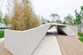 公园中心位置新增一处核心景观,设计将童稚乐园和公园管理服务中心整合进全园的制高点观景台中,建筑以曲合的线条形成向心性且安全环抱的儿童游乐广场,建筑所在的园区中心视野开放、流线通达,便于成人照顾儿童,并最快地抵达各区域活动;坡道屋顶盘旋而上引导人行至公园最高点,一览全园及城市风貌。儿童游乐设施集合进建筑表皮,管理服务中心置入一层空间,包括办公,运动超市,零售,卫生间等功能,半开放走廊和竖向百叶立面提升建筑通透度并增强与人的互动性。