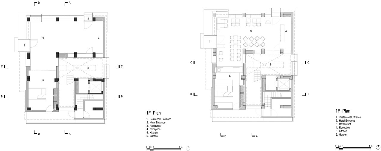 穿过巷道步入酒店后,访客站立于公共空间,视线随着轴线不断移至向上。原本将各楼层连接起来的楼梯井,被切割、扩宽,创造出全新的垂直庭院。切割开的建筑立面及上方的采光井,将自然光及建筑外的街景引入至建筑内部。全新的金属楼梯悬置于垂直庭院之中,访客由此到达各层客房及屋顶平台。新与旧在建筑内并存融合。