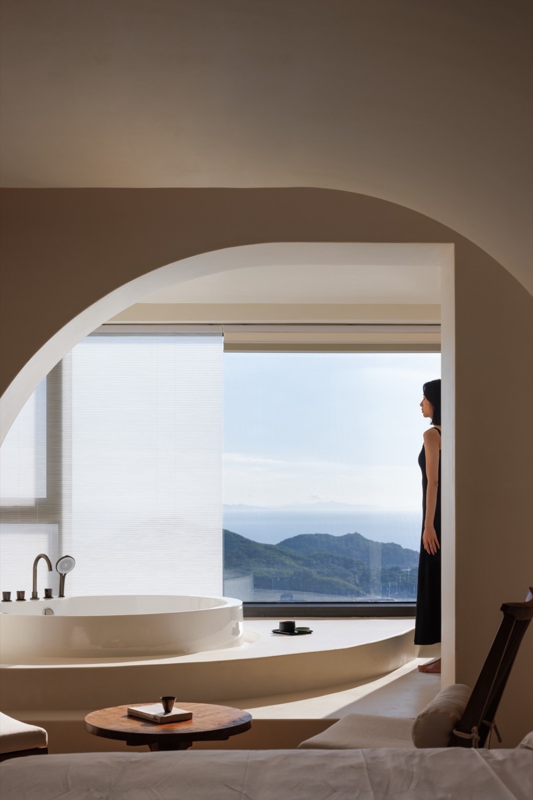 构筑最大的开窗尺幅,展现海景入画的意趣,层层递推的弧形轮廓赋予了窗景二次新生,升华了景观艺术。打造多层次地台,谱写结构韵律,嵌入大型浴缸,抒发悠然之意。底色与布局的留白,烘托了陶罐、草编地垫、木桌等物品的治愈力。