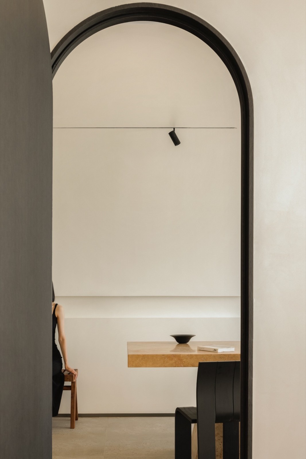 从地面拔起延展至顶面的曲形,伴着方位各异的暖光,予人一种安心的包裹感。设计,通过各种材质和谐共生的姿态,引人解锁空间新的维度和发展。大地色系的石桌,看似是凝固的物件,实则是流动的艺术,让人和自然紧紧连在一起。