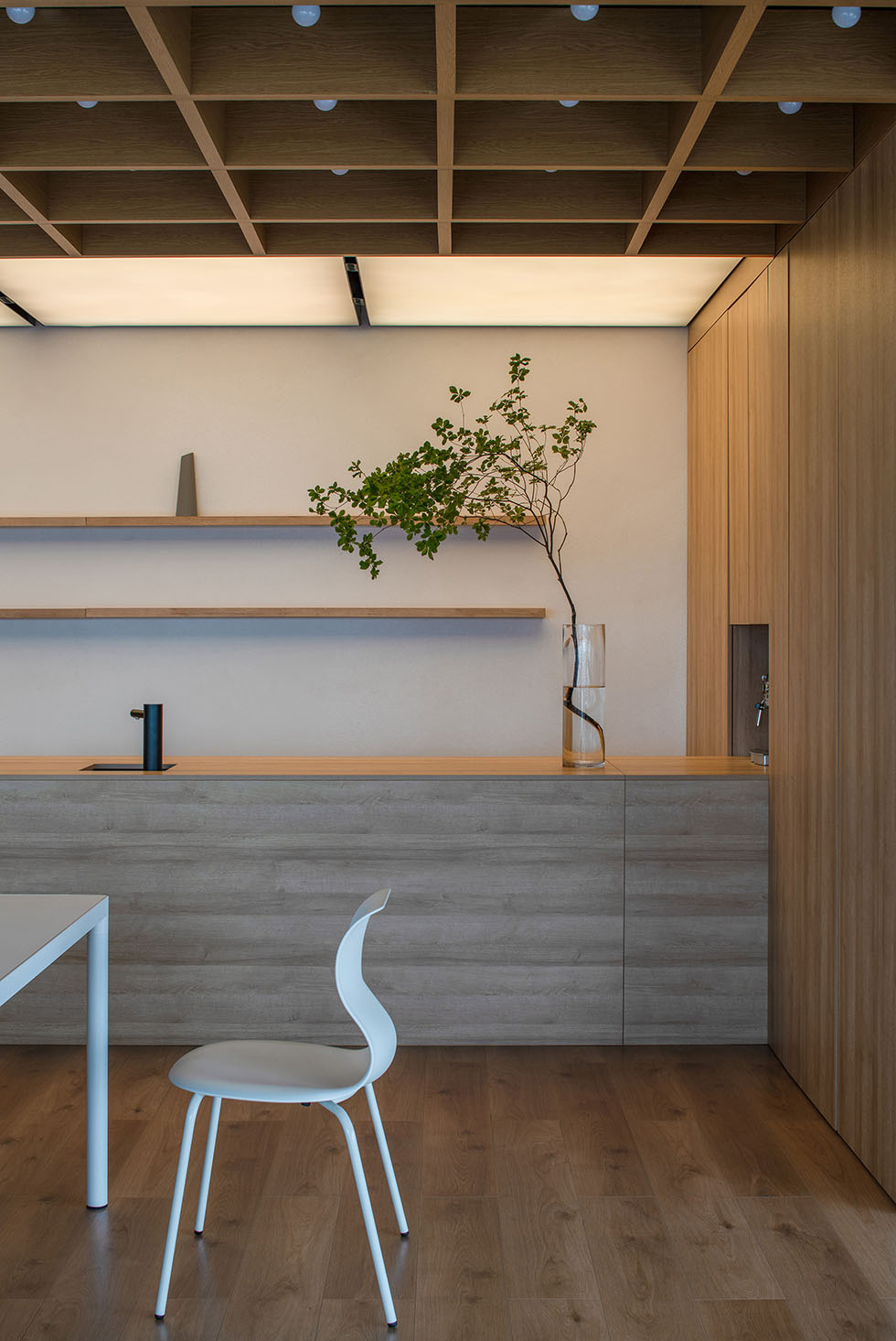 慕达建筑将写字楼原有的标准化装饰拆除,解构和重建空间的秩序。4.2米的建筑层高被设备层占用了近1米的空间,设计采用整体镂空的方格木纹吊顶,既保留了建筑原始层高,又形成了统一而有序的空间肌理。