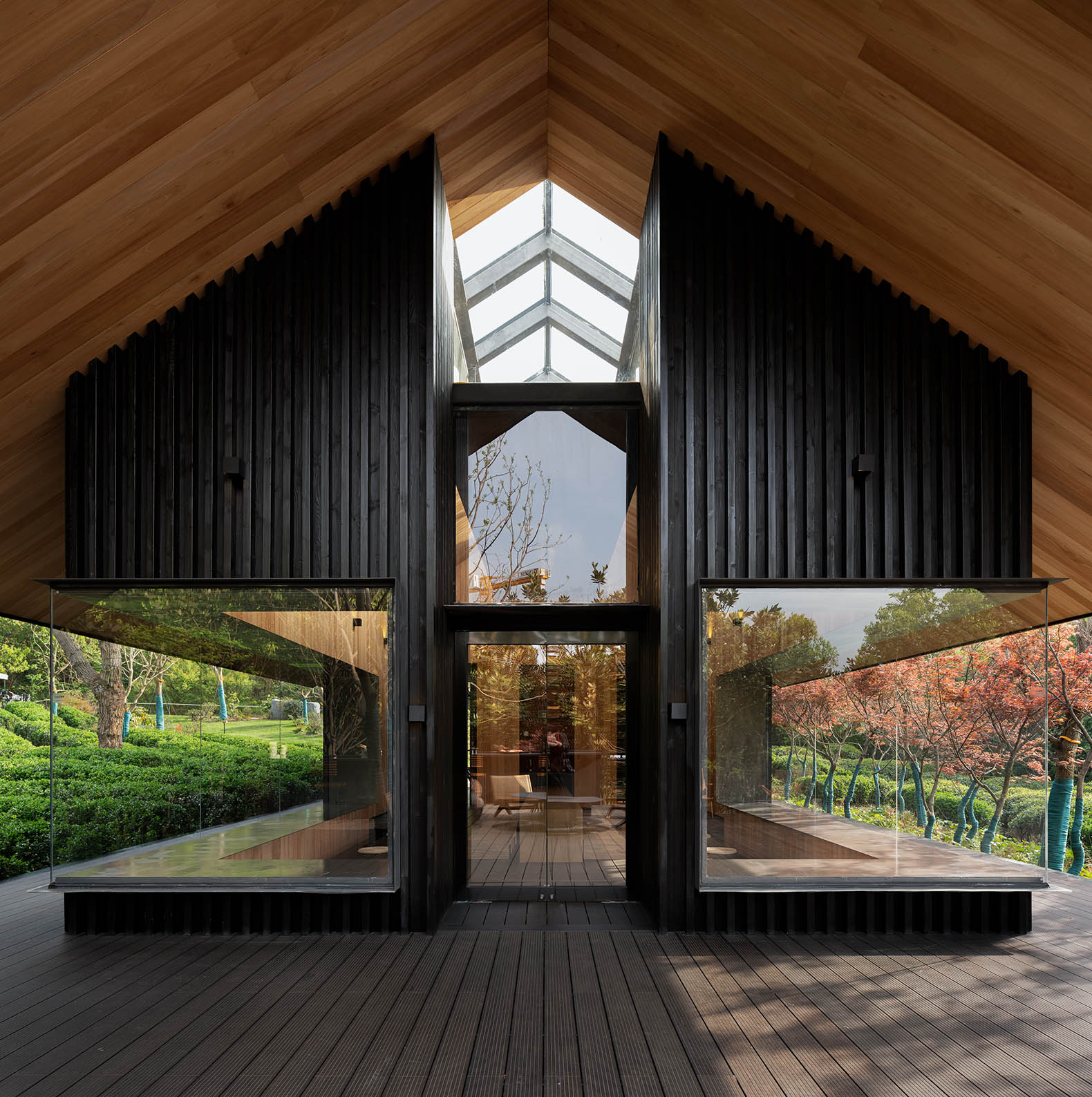 一条隐秘的小径指引着静谧的方向。高大的树木界定了小径的空间感,带领人们来到茶屋。进入茶屋,光线接管空间。入口空间是一个半开敞的灰空间,深色的碳化木墙面弱化了光线,仿佛隔绝了外部的世界,也屏蔽了心中的杂念。人们开始沉静,照见心中的光明。经过短小的过道,一瞥落地窗引入片刻的自然,便来到主室。原木色饰面板明亮了主室空间,两侧连续不断的转角凸窗将林中的光线与自然引进屋内,延展成一副全景的水墨画。建筑、自然、人此刻融合在一起,内心豁然开朗。屋脊处的条形天窗被半空中的黑色金属板遮挡,天光从金属板两侧泄入屋内,引导人们观照内心。走出主室,是树木林立的室外平台。茶屋空间秩序得以延续,内外的界限被消解,人们感悟心中的自然。