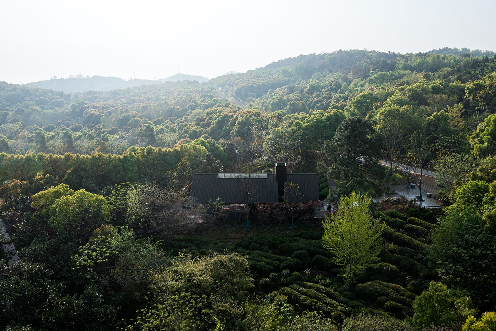 米思重塑了人们对传统建筑的集体记忆——一个坐落于台的双坡顶房子,并以此原型作为“屋型”的设计概念。它坐落于一个延展的台之上,对称的双坡大挑檐向两侧铺开,仿佛漂浮于林海之舟。高耸的长方体将茶屋切割为两部分,形成相对独立的入口空间与主室空间。长方体作为服务间,顶部突出屋顶,设备藏匿于此,也隐喻着烟囱的形象。