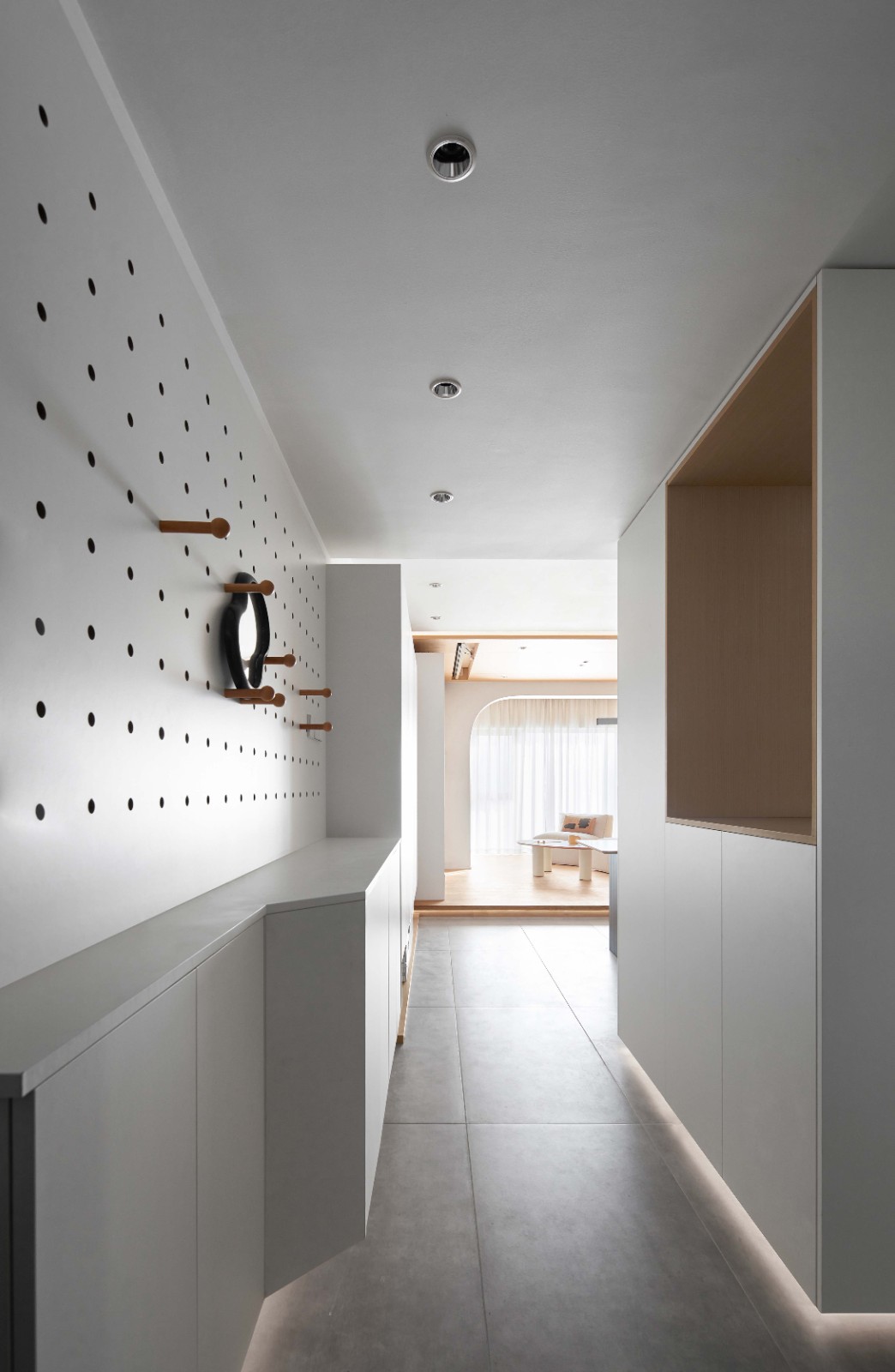 矮柜+窄柜,做了翻斗柜,放一些宝宝的鞋子,洞洞板美观可以兼顾实用型可放置衣物和包包等。下面是挑空鞋柜,方便换鞋,夜晚回家,家里灯光也会亮起,右侧半高柜不仅增加空间的趣味性,还可对开放式厨房有补充性收纳。在入门空间的柜子全部做了悬挂处理,右边大落地柜借用灯光处理了悬挑的感受。