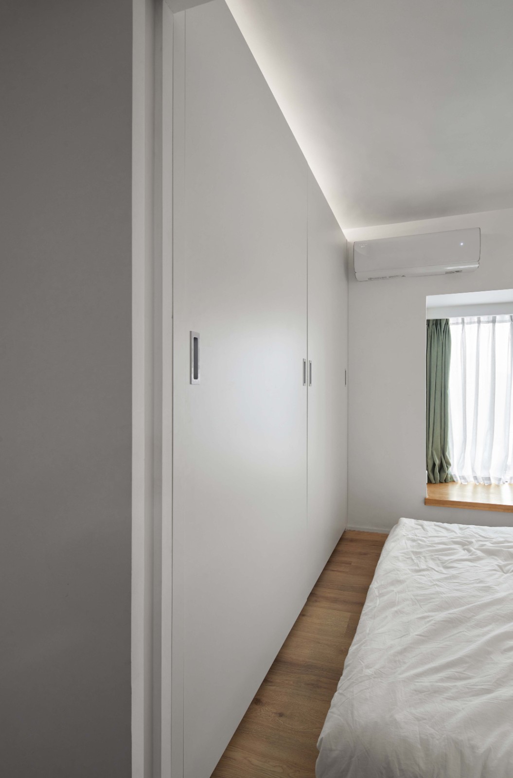 在空间中我们采用了一种新的柜体,巴士移门系统是一种创新的开门方式,它突破了门扇关闭时错位的传统方式,能实现平滑的自动开闭,且柜门关闭时两扇门处于同一平面,视感上更为舒适,简洁。旁边有一个小卡座,可放置书籍或小坐,看向窗外享受阳光,享受,慢生活。