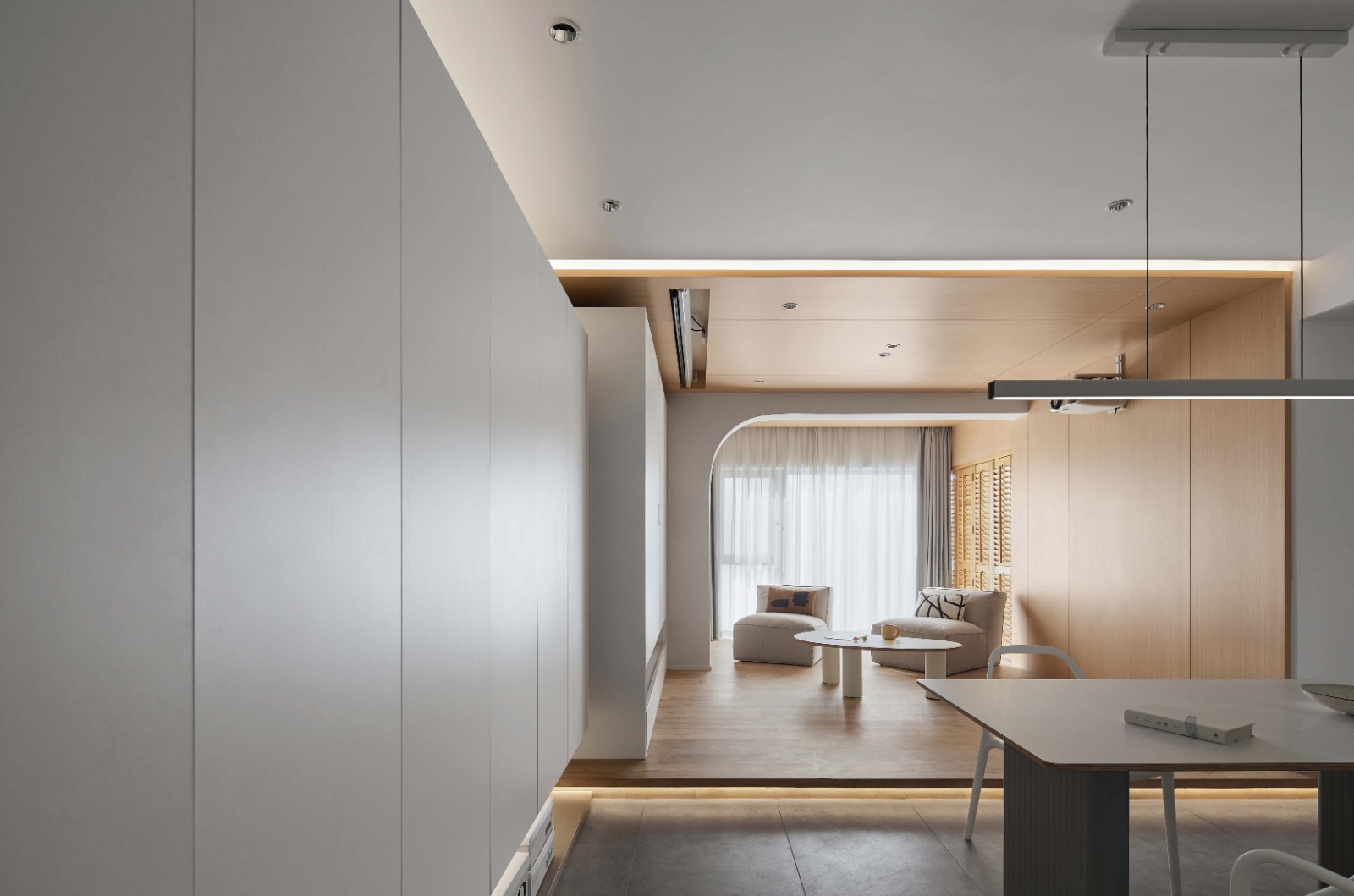 原始结构中的每一个封闭的空间都相对狭小,功能无法得到满足,我们将空间进行新的切割,入门区利用功能柜打开了环形动线,让厨房和门厅更加开阔。餐厅和吧台区位于核心区域,基本以白色为主,可以更好的互动客厅,客厅区拉伸至阳台,形成小盒子影音室,可以更好的享受一家的观影时间。