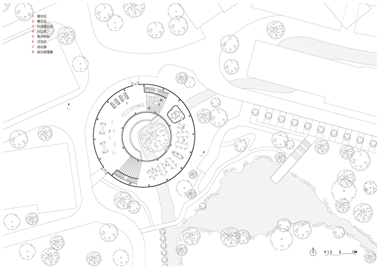 后来由于景德镇陶瓷设计中心的入驻,建筑功能发生了变化。当以新的空间需求重新启动室内设计时,我们对于建筑空间的基本构架和新的功能需求做了拟合,并激发出未来的使用场景。我们将随地表起伏形成的两个平台分为展示与办公区域,并将连接两个平台的台阶作为立体的展台和一个开放式的阶梯教室。两个平台和两段坡道形成了一个随地形起伏的圆环,圆环内外皆是野意的自然,这无疑给最终入驻的陶瓷设计师提供了一个灵感与自然碰撞的空间。