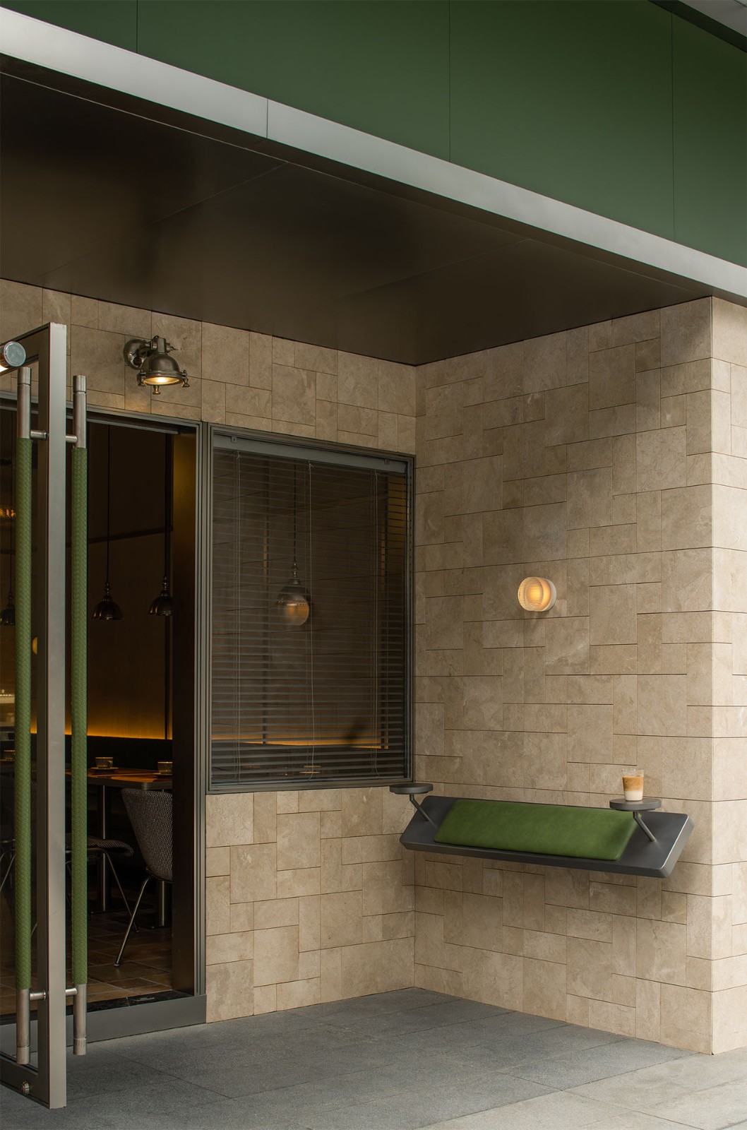 低飽和綠和高飽和橘的跳色搭配,結合啞光不鏽鋼的組合,是當下的流行元素,也希望給人一種進店無壓力的歸屬感。