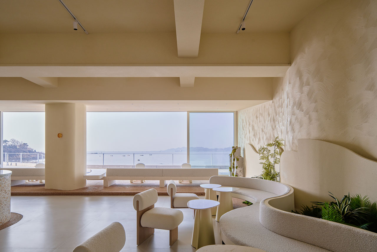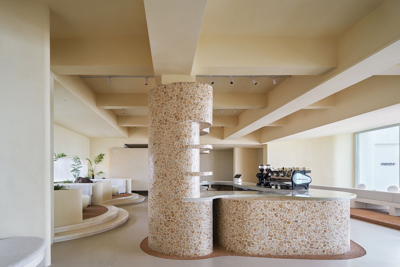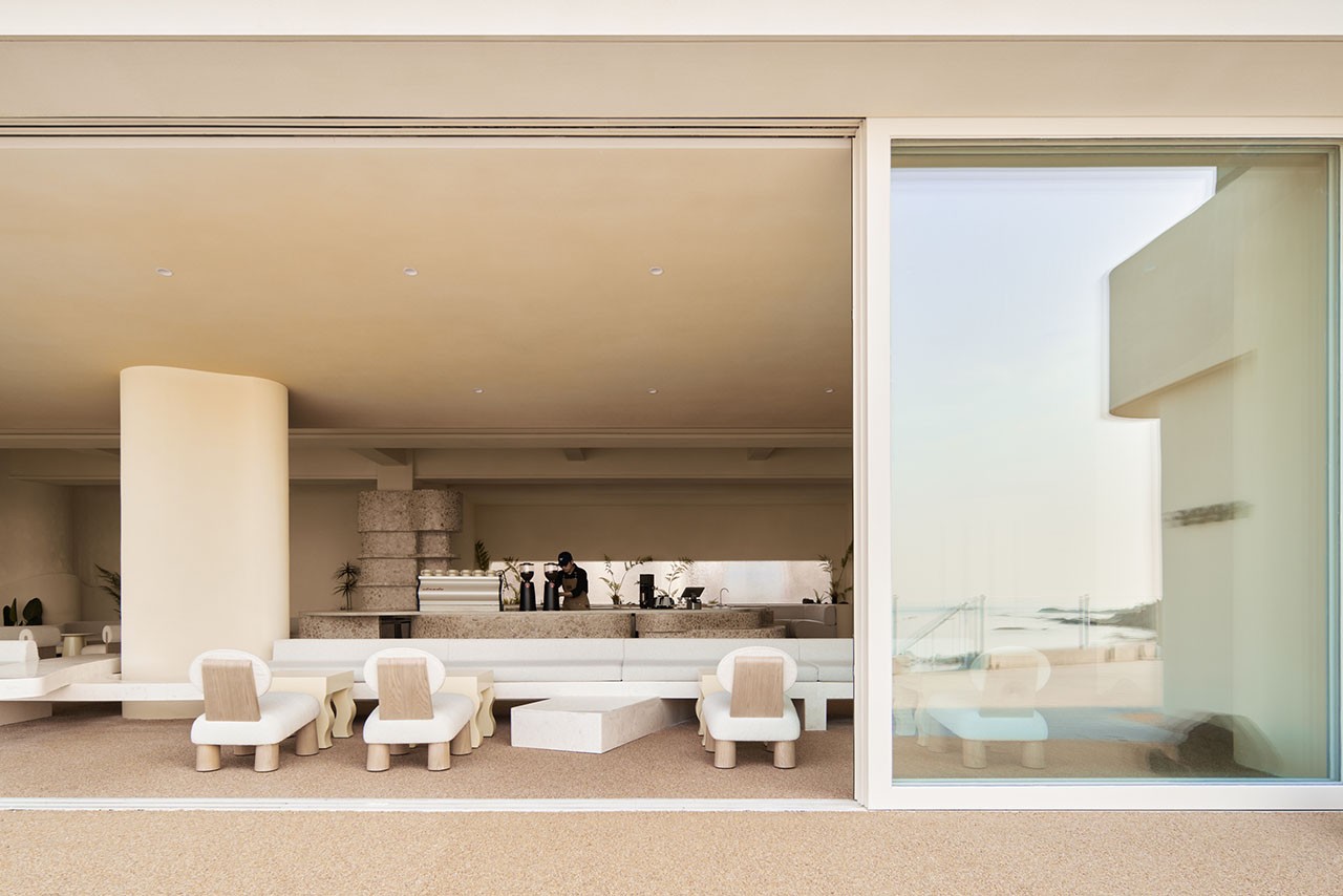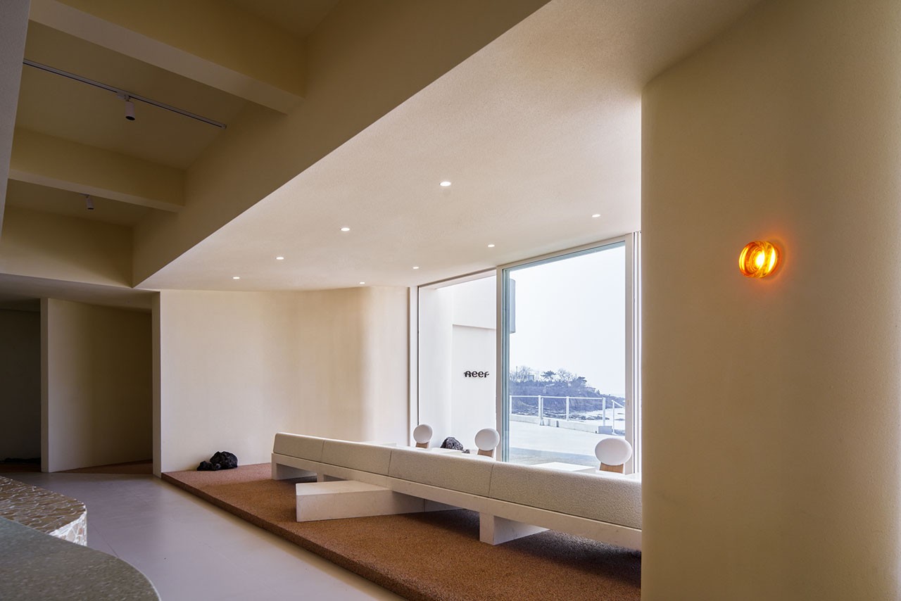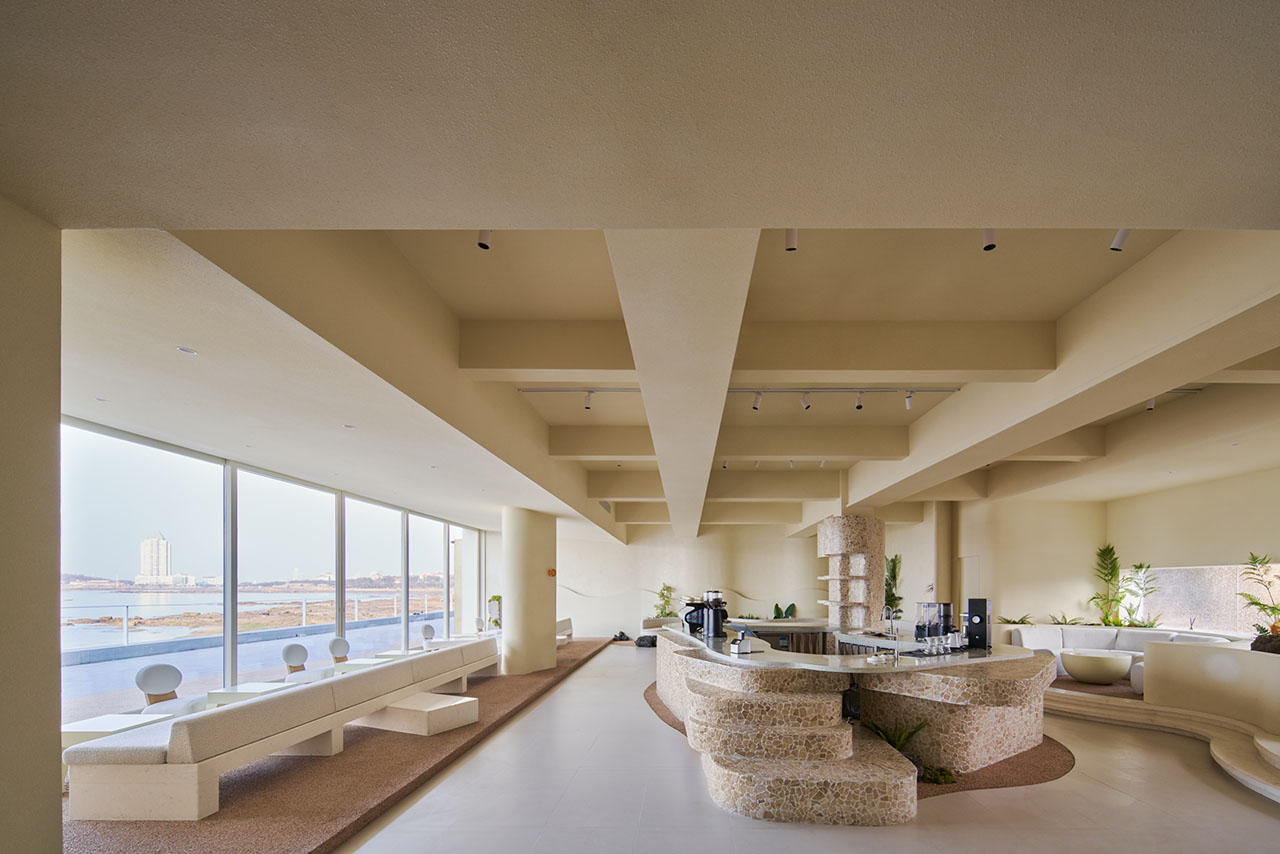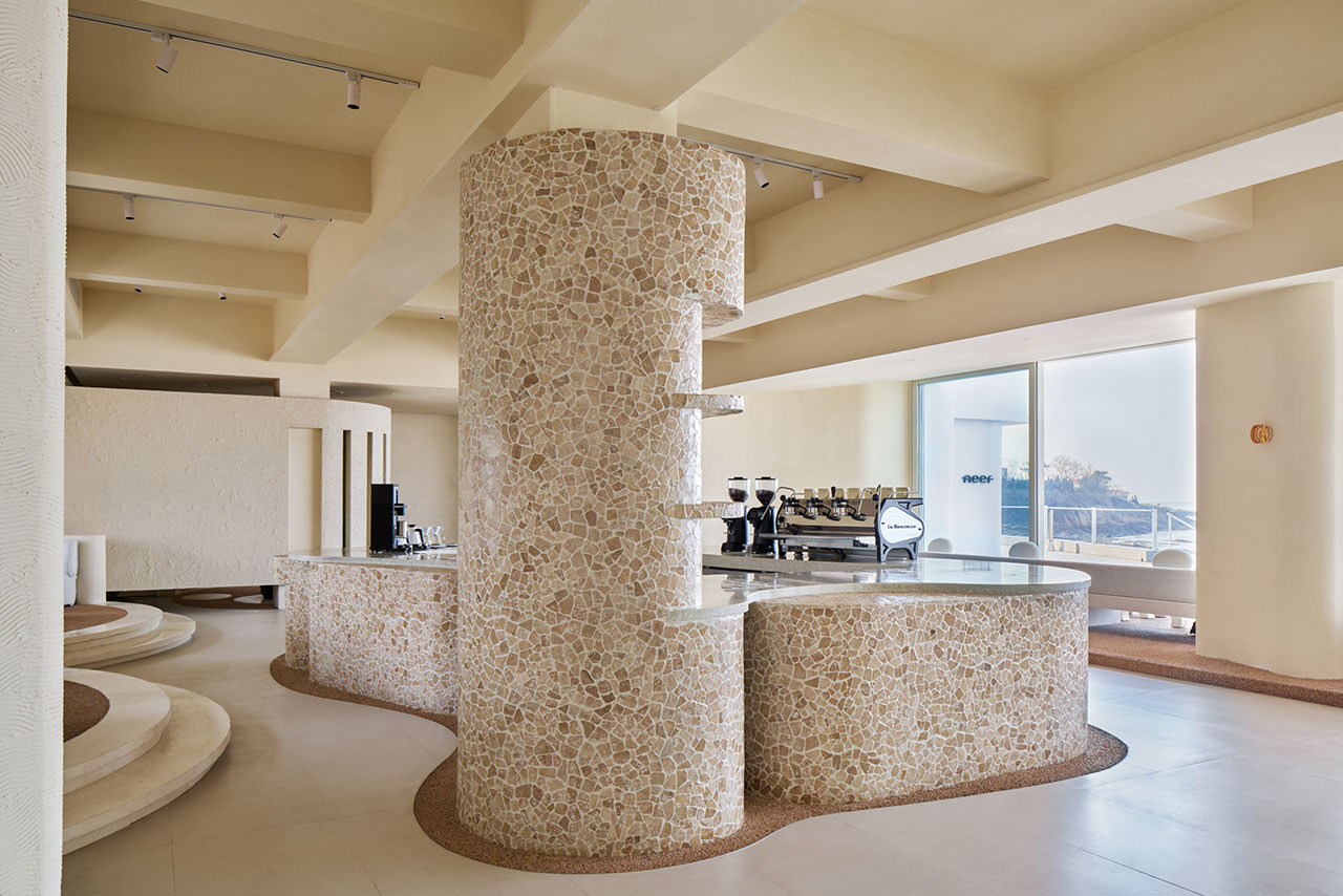 大型石块错叠的咖啡吧台作为整个空间的核心内容咖啡师的制作场景在其中围绕,同时将客人们的视野引向壮观的海岸。不同的散座区以吧台为中心向外延伸,通过不同层高的落差带来整个海滩的海滨盛景。用餐区在规模和简洁感上均与海洋形成呼应,是一个巨大且结构清晰的开放空间,拥有来自所有方向的视野,在建筑体块庇护下成为一个室内空间与自然景观上互通的场所。