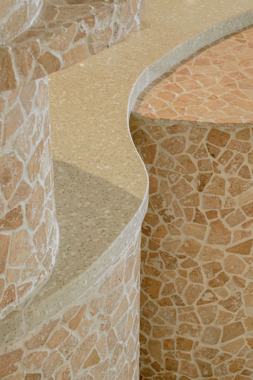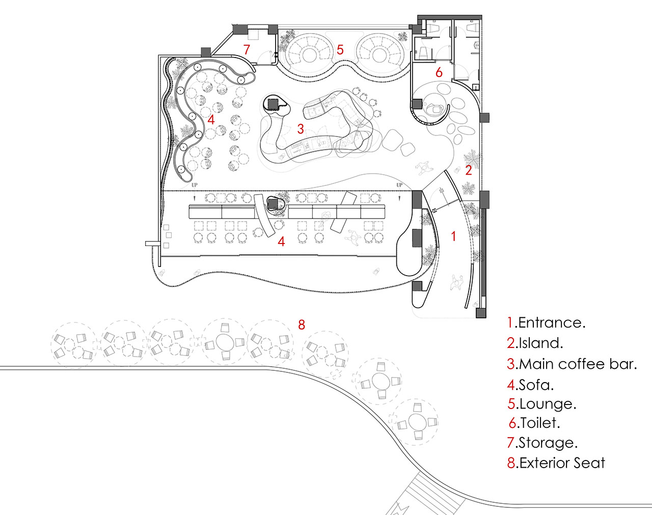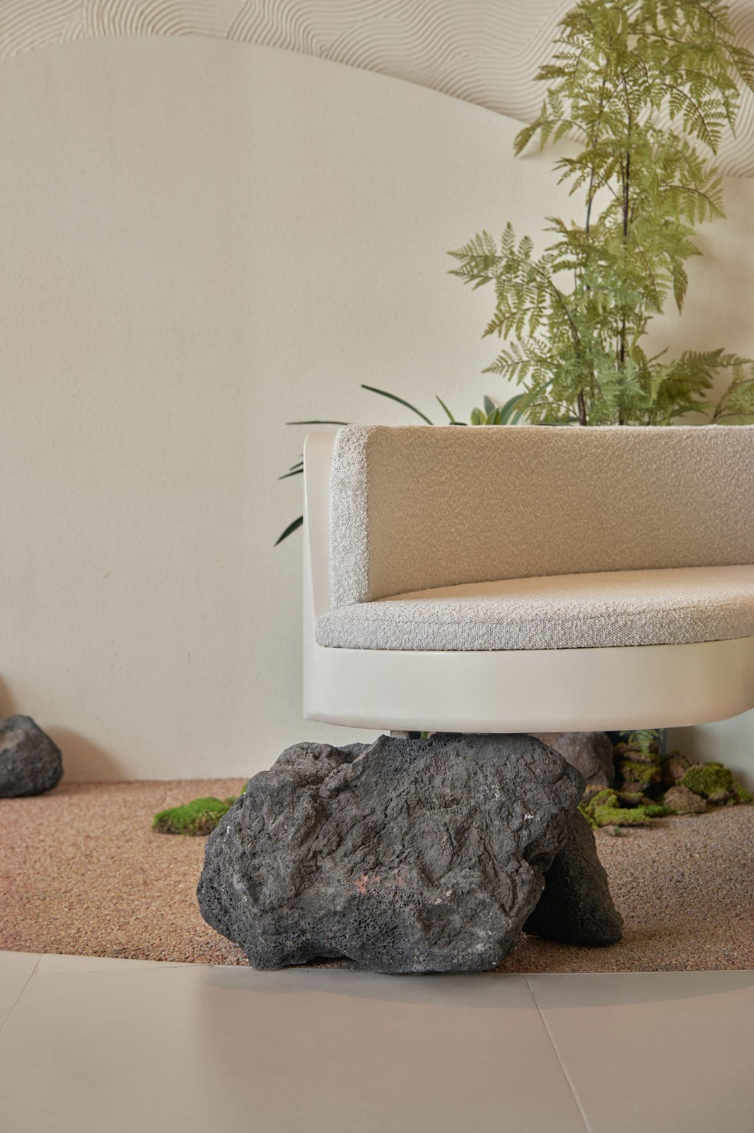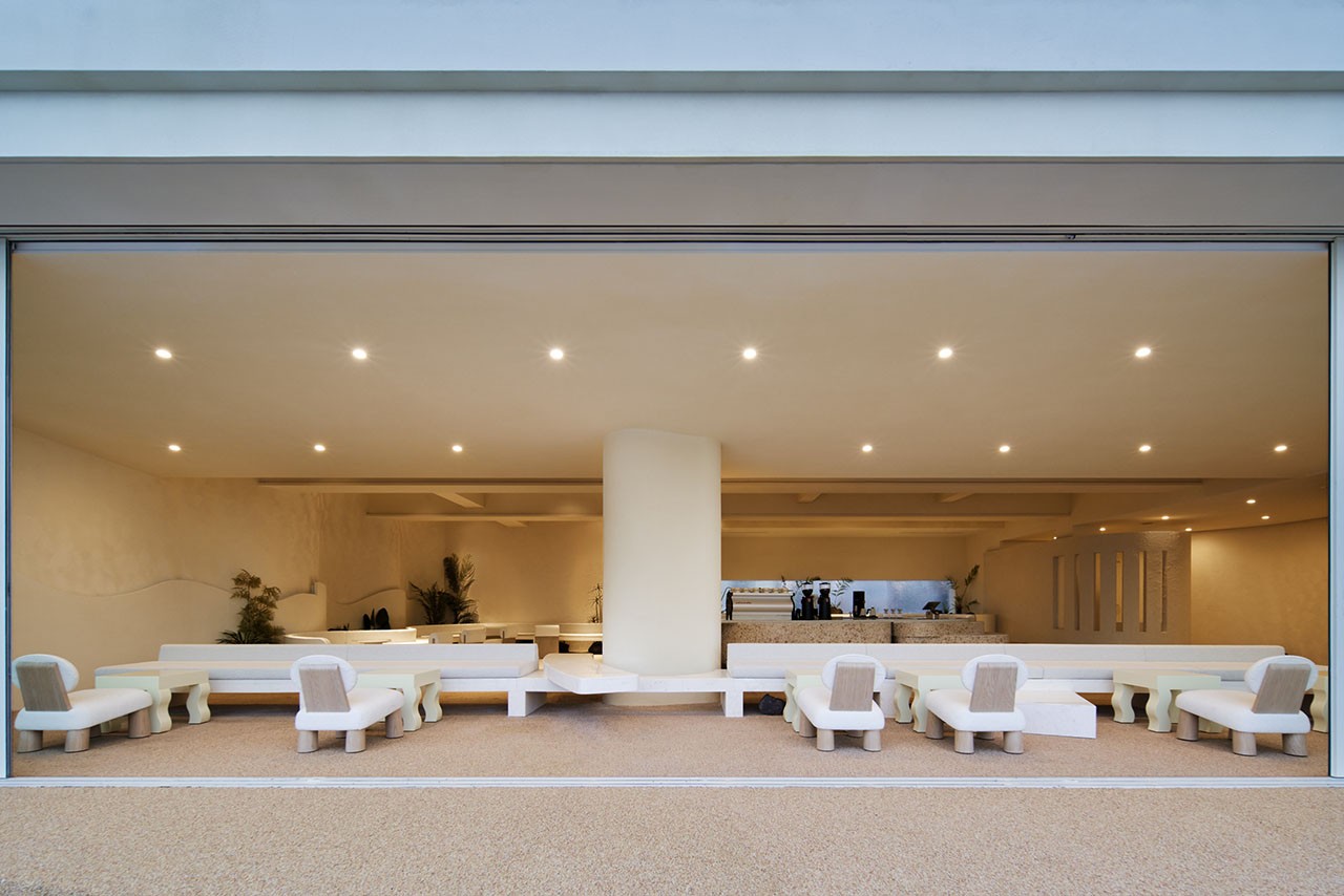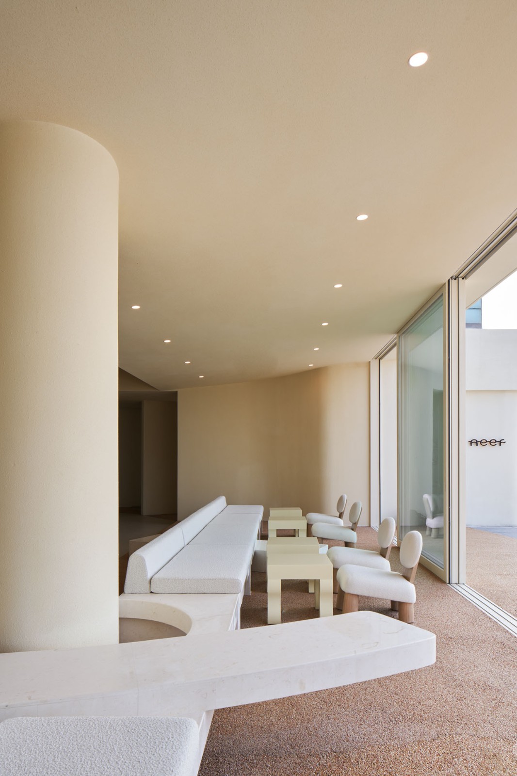 大型石块错叠的咖啡吧台作为整个空间的核心内容咖啡师的制作场景在其中围绕,同时将客人们的视野引向壮观的海岸。不同的散座区以吧台为中心向外延伸,通过不同层高的落差带来整个海滩的海滨盛景。用餐区在规模和简洁感上均与海洋形成呼应,是一个巨大且结构清晰的开放空间,拥有来自所有方向的视野,在建筑体块庇护下成为一个室内空间与自然景观上互通的场所。