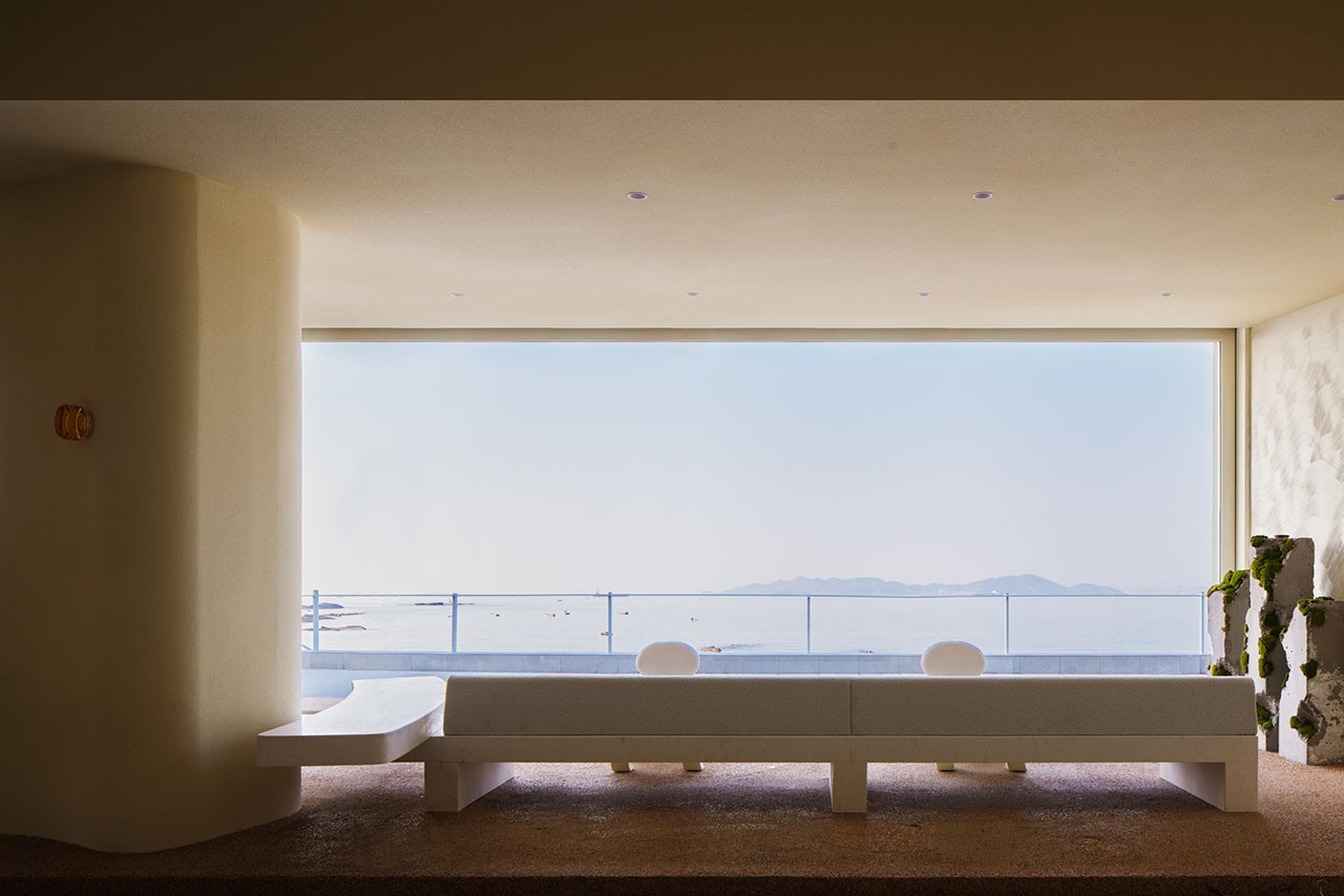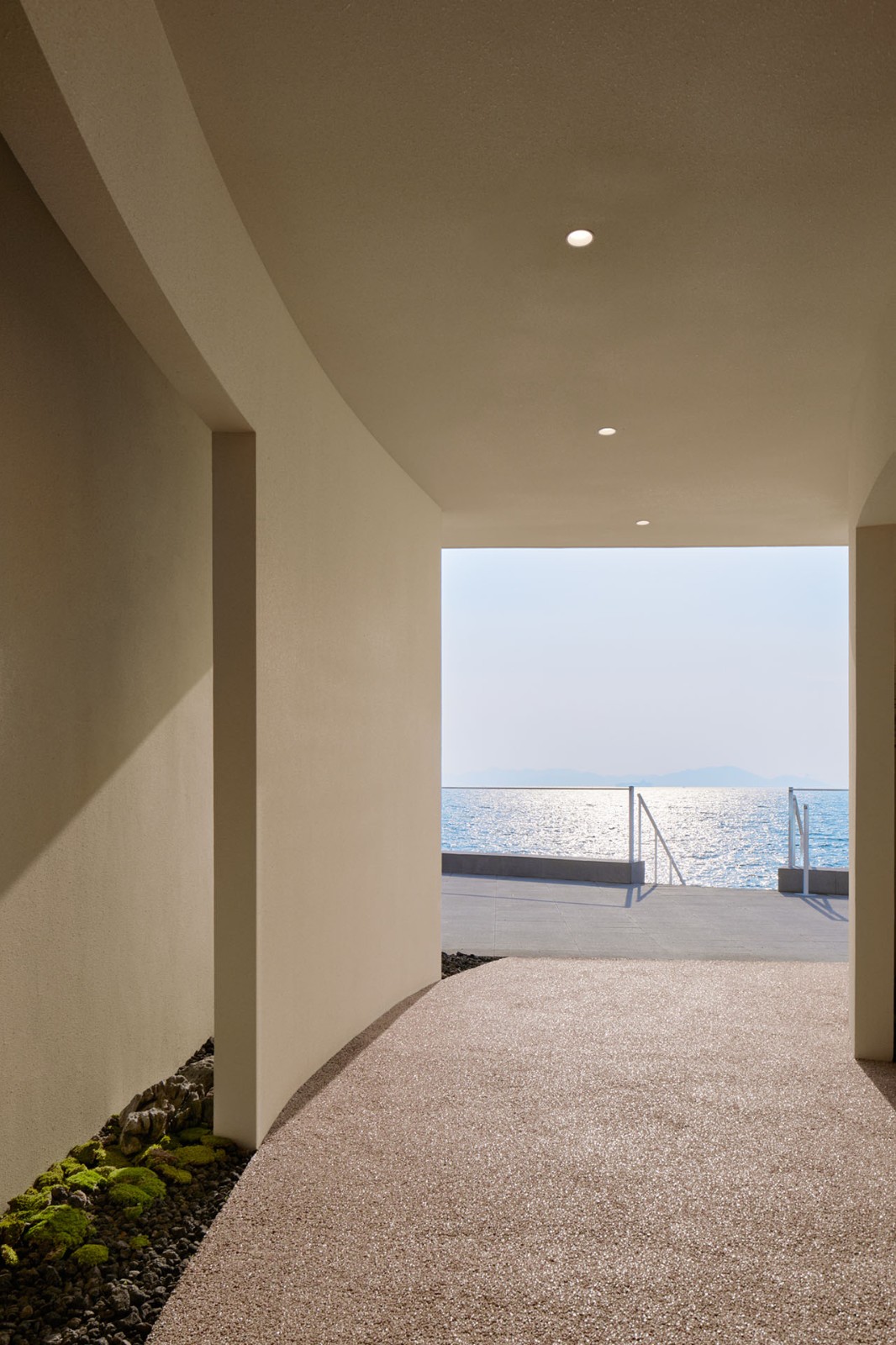 线性拉长的空间中,随着空间的收与放,光线的明与暗,用餐者在行进中感受光线和动线有节奏的呼吸。绕曲行走的动作参观者室内空间的体验不断被转向,在这里,大海成为了空间感知的重要坐标。