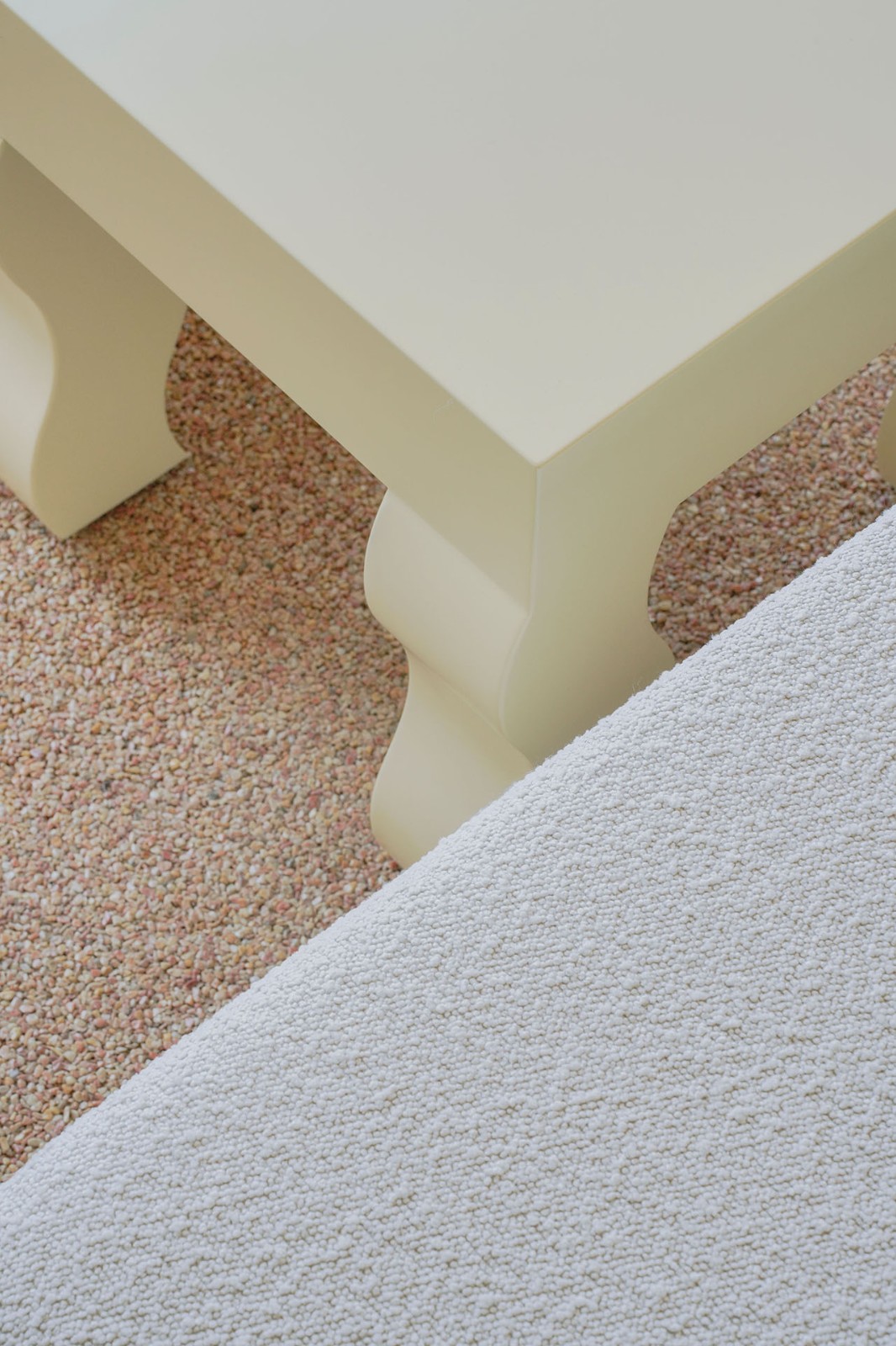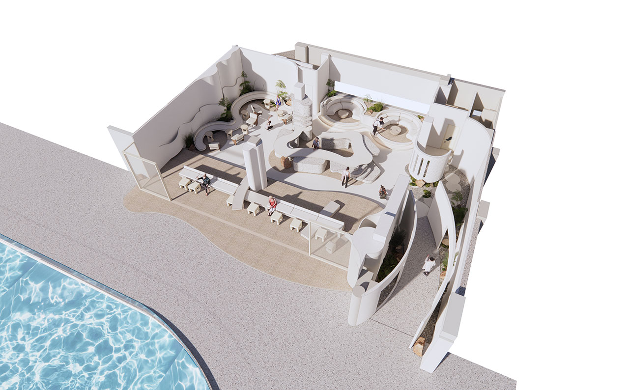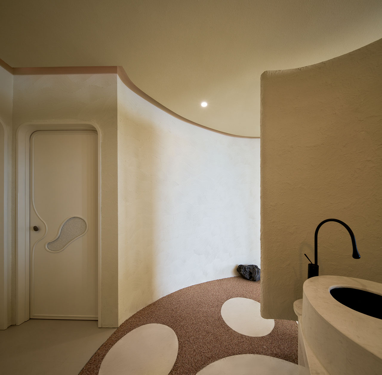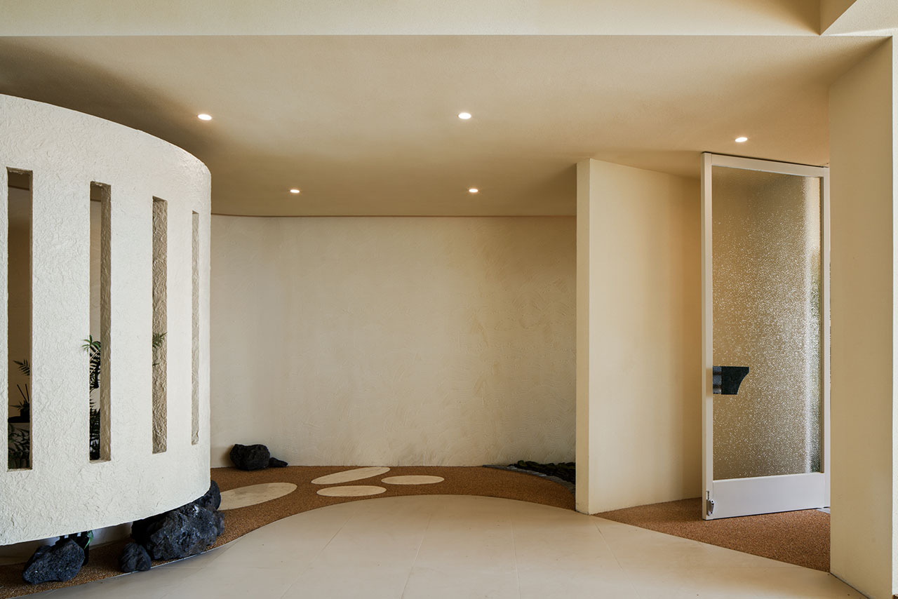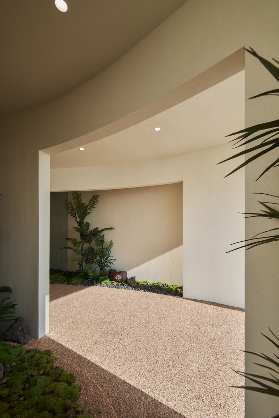 项目探索了一种自然的度假风格设计,优美的空间体量通过柔和的米色奶油色外开斜切天花结构得以凸显。半弧形的入口幽曲将人们引向以水纹磨砂玻璃围合的入口面,并在层叠的原石块吧台六面可打开的落地窗作用下增强了与海洋亲密存在感。