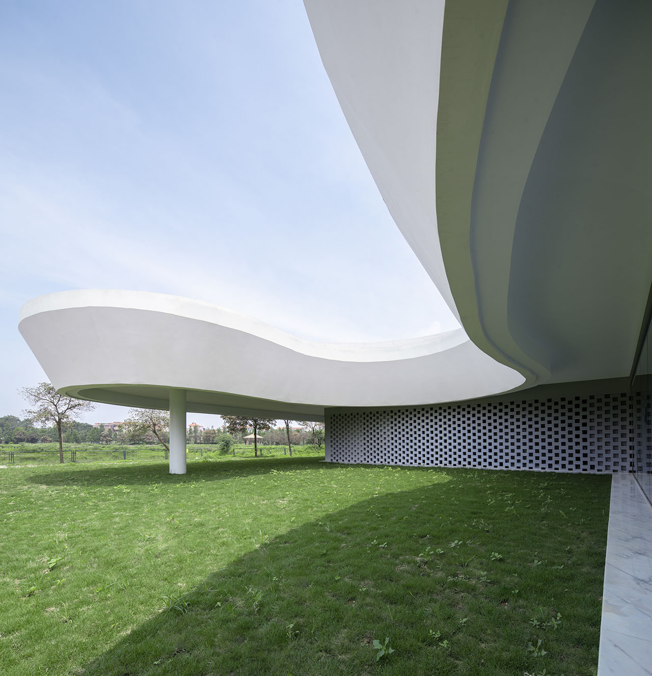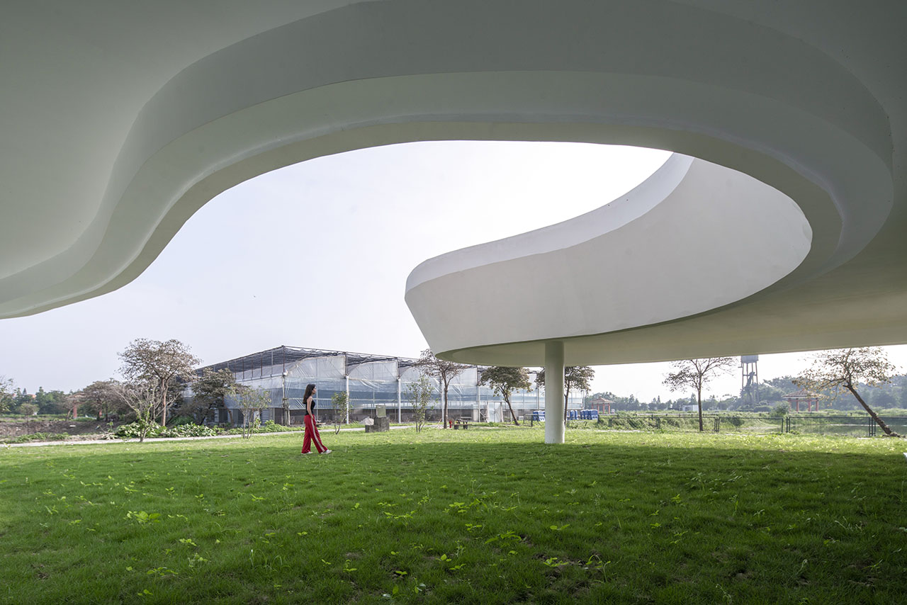 “涟漪”是西樵镇渔耕粤韵综合展馆群里的4号馆,也是第一个落成的建筑。它是1号馆“曾经沧海,云上桑田”的云上概念延伸。但我又不想重复我习惯的云主题。无法离开上海的我一遍遍看着吴刚发来的现场照片,突然,我注意了到水塘里喷水在水面形成的涟漪,有着白色的花边。那一刻,我为之着迷。我想在水塘边上的软土开出一朵涟漪。