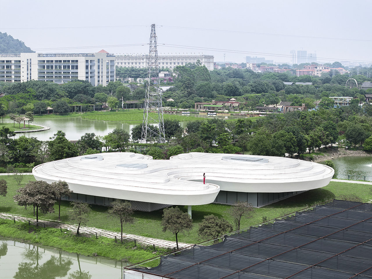 造价很紧。我就把4号馆的屋盖设计成涟漪,展厅还是便于展陈安排的规则的方形组合。曲线和直线的冲突,就需要突出屋盖而削弱展厅的立面。涟漪应该是控制立面包括第五立面的要素。同时我更希望她是飘浮起来的涟漪。