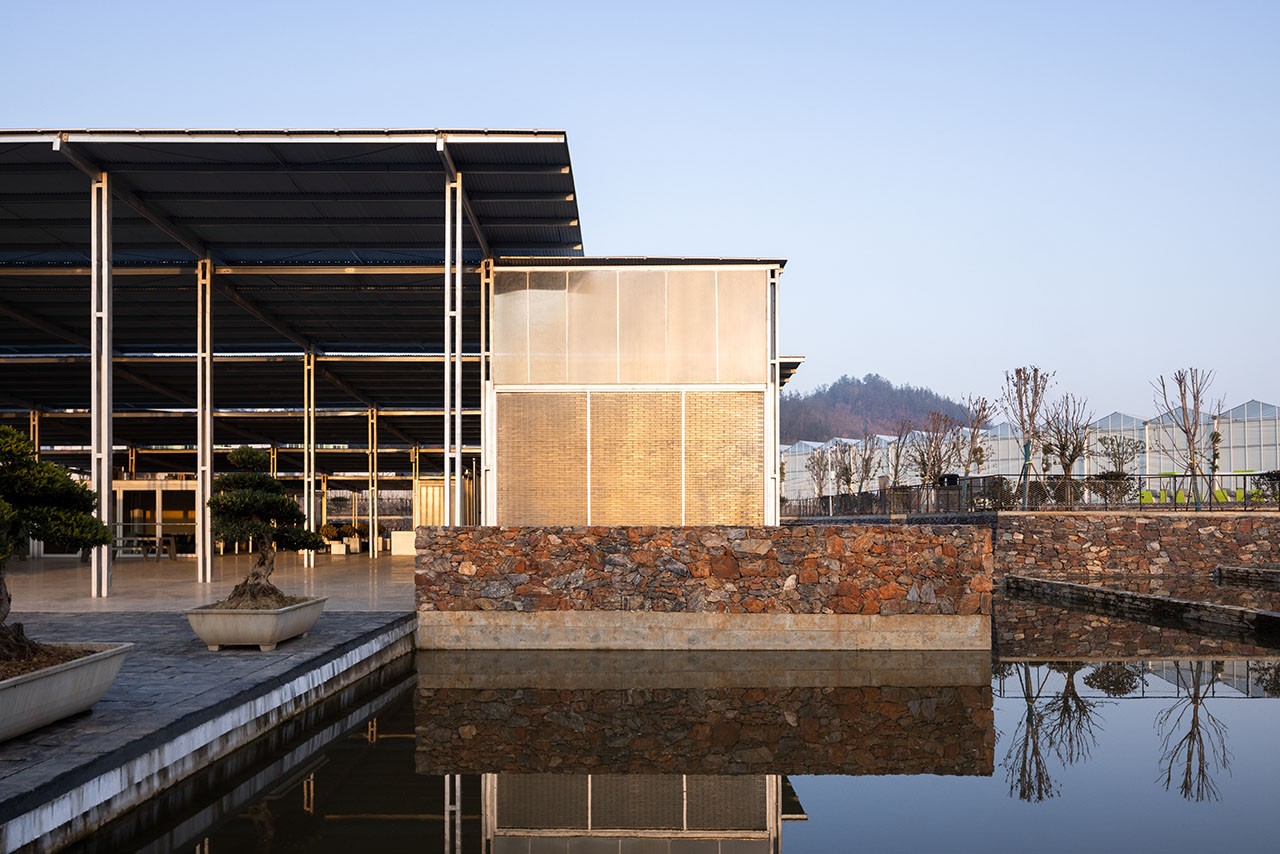 建筑入口是迎接的姿态,有着相对较高的敞开面,进入之后,随着地形的增高,“棚”的高度却逐步降低。行进路线上空间高度的变化同时影响身体对空间的感知,直至最后离开这里进入园区游览的层次,“棚”降低到一个具有亲切感的高度,营造出庭院式的停留空间。