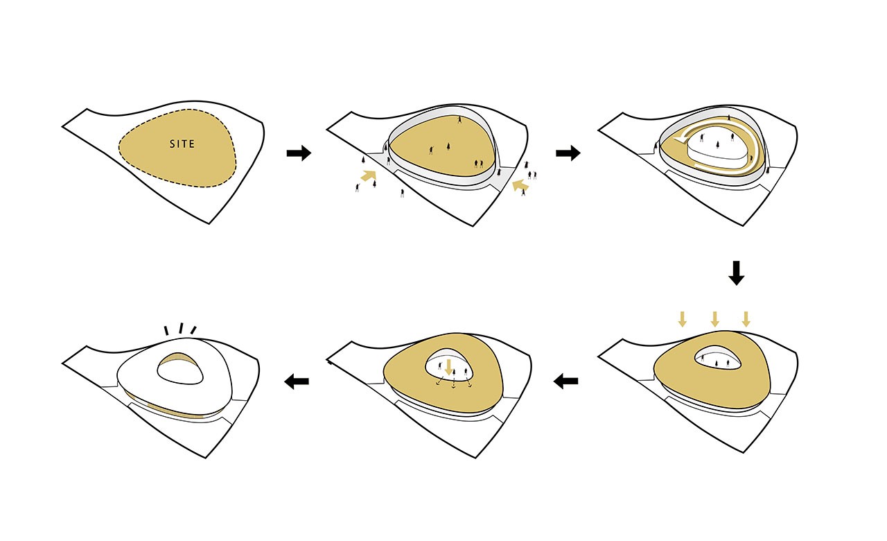 环形坡道在符合坡度要求的同时需要与屋面倾斜角度相配合,多次调试之后得到了最佳屋面角度与坡道起点,这些都在施工图设计过程中得到了充分的解决。