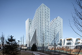 长久以来,住宅的朝向机制造就了楼栋平面及立面的单调性,尤其北立面与山墙面往往成为缺乏吸引力的“背面”。春风金沙的设计基于阳台与层间挑檐的设置打破了这一定势。水平线条舒展、优雅,与平静、安宁的金沙湖景致相得益彰。