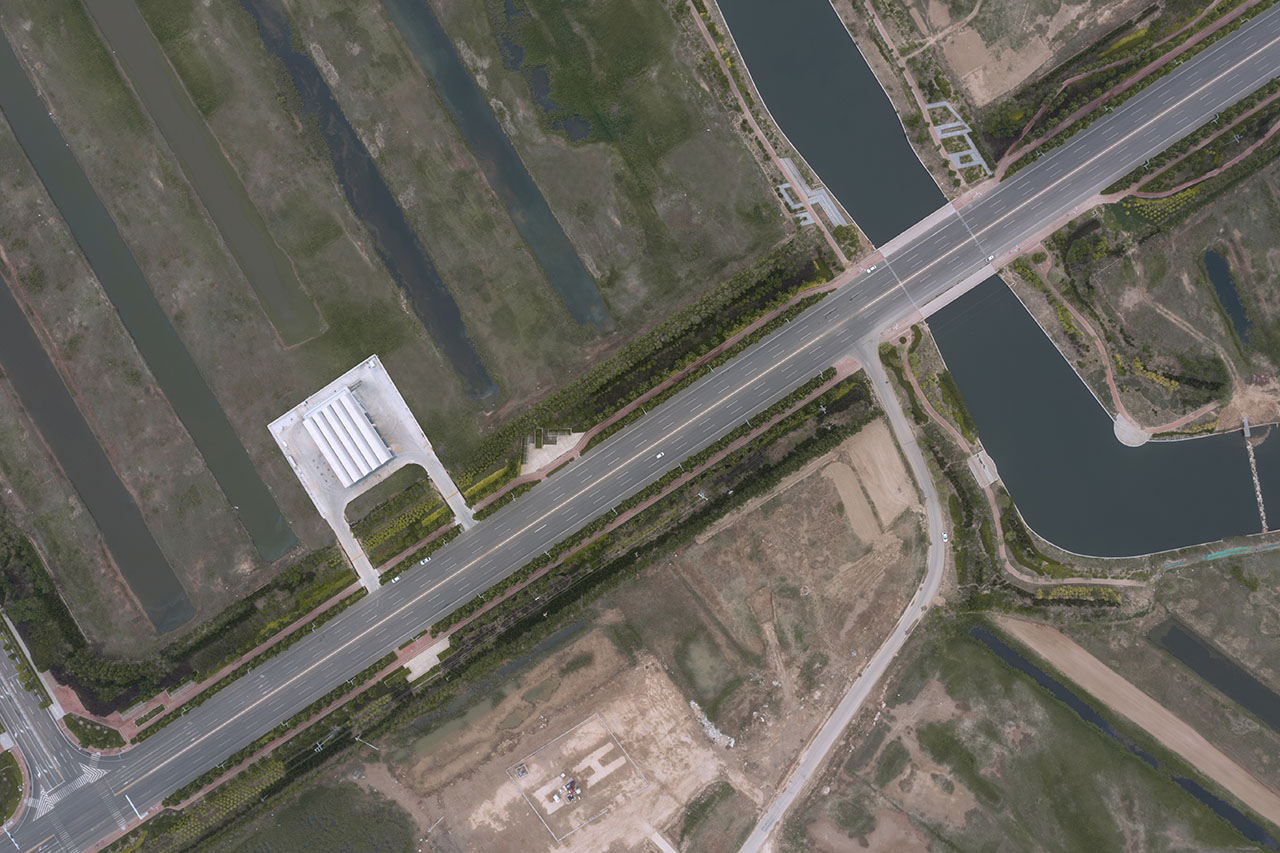 项目位于市政路北侧的一片稻田中。东营土壤盐碱含量高,田间设有多条水带来排碱排盐。水带和田地交替排列形成了条状肌理。结合场地肌理,我们在加油站设计上采用了连续筒拱屋面。筒拱截面采用了标准半圆形,暗含了油罐车和输油管道的筒形意向。