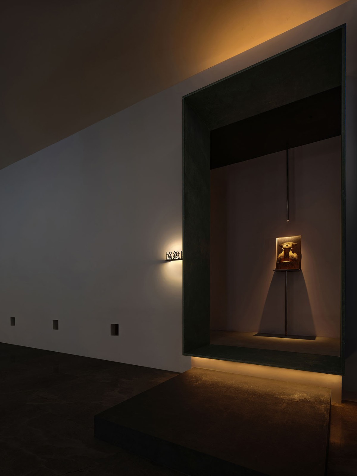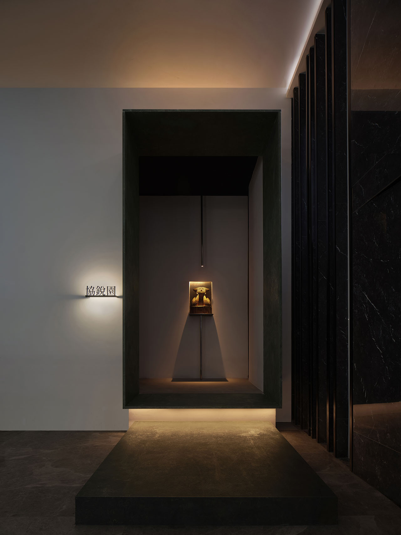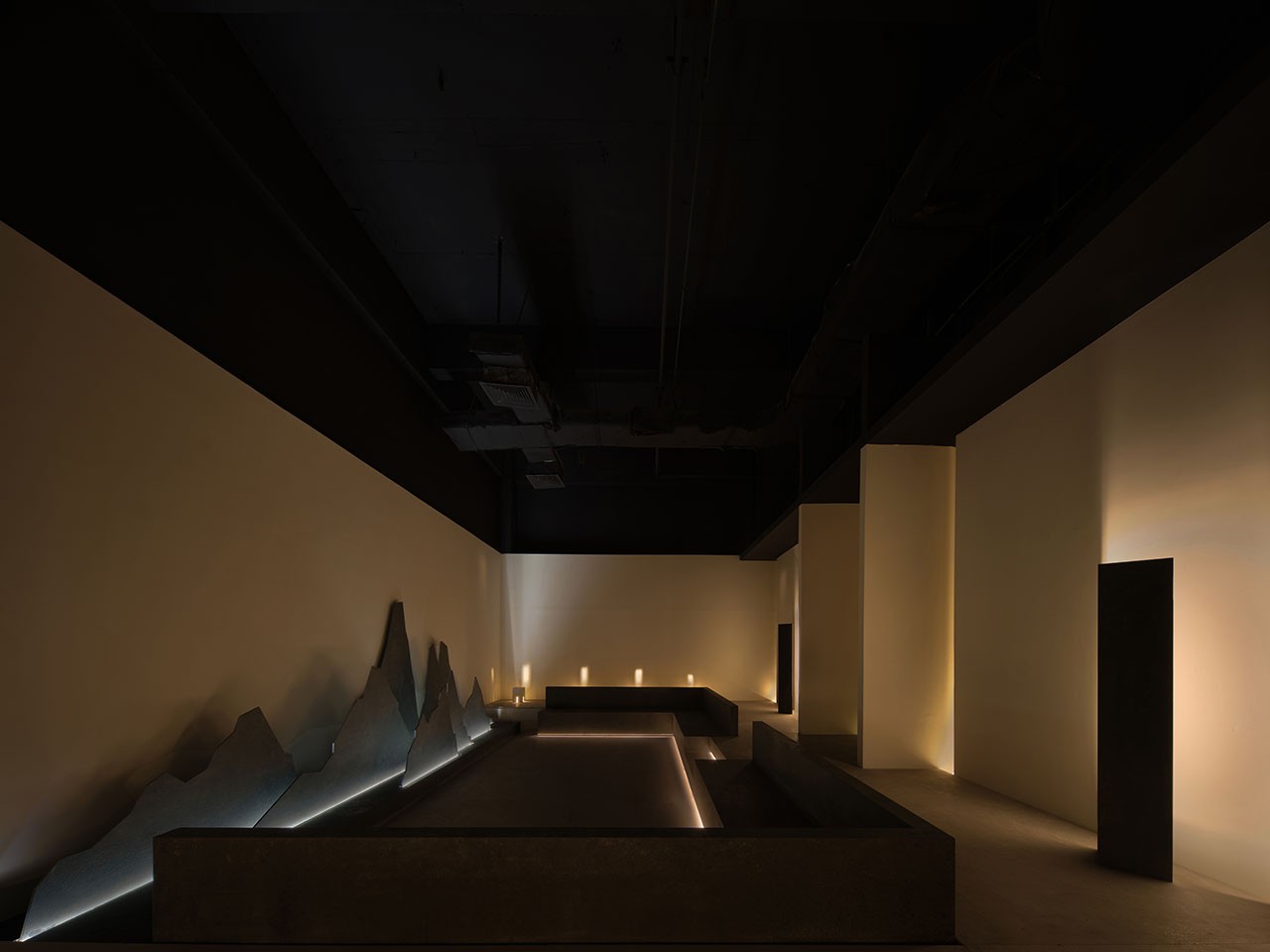 名为《协锐山》的“山体”汇聚势能似能将时间凝固,一览纵山小,空间布局上是一个下沉的卡座,通过摩天青岩板切割山体造型工艺,层叠呼应,山体之间灯光闪耀,且听山间弦音。仿佛摒弃世间尘埃,在烟雾弥漫中踱步,竹影摇人心,幽香久相伴,这是一种人与自然的对望、一种敬仰、一种冥想放空的天地,谱写旷世情韵。
