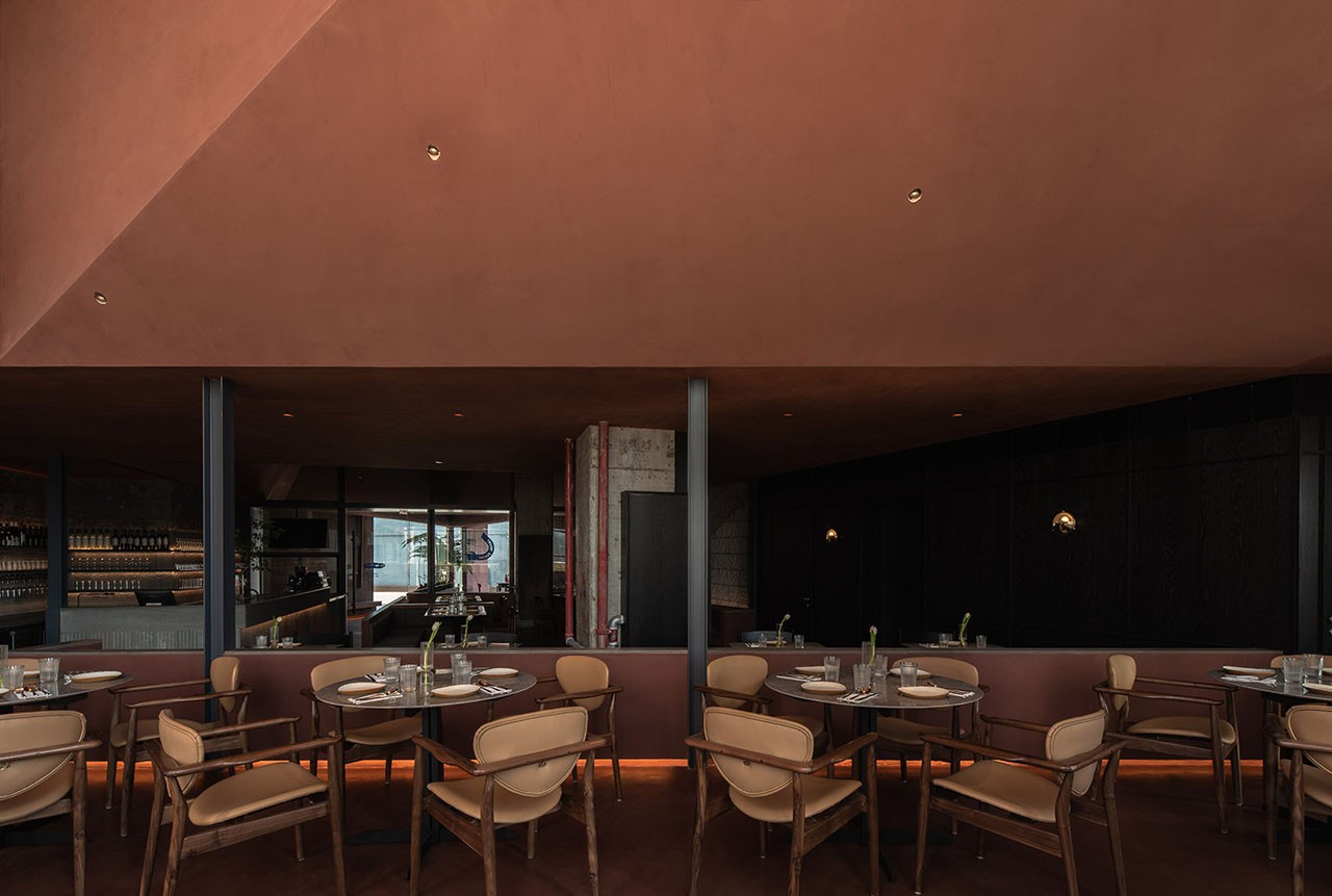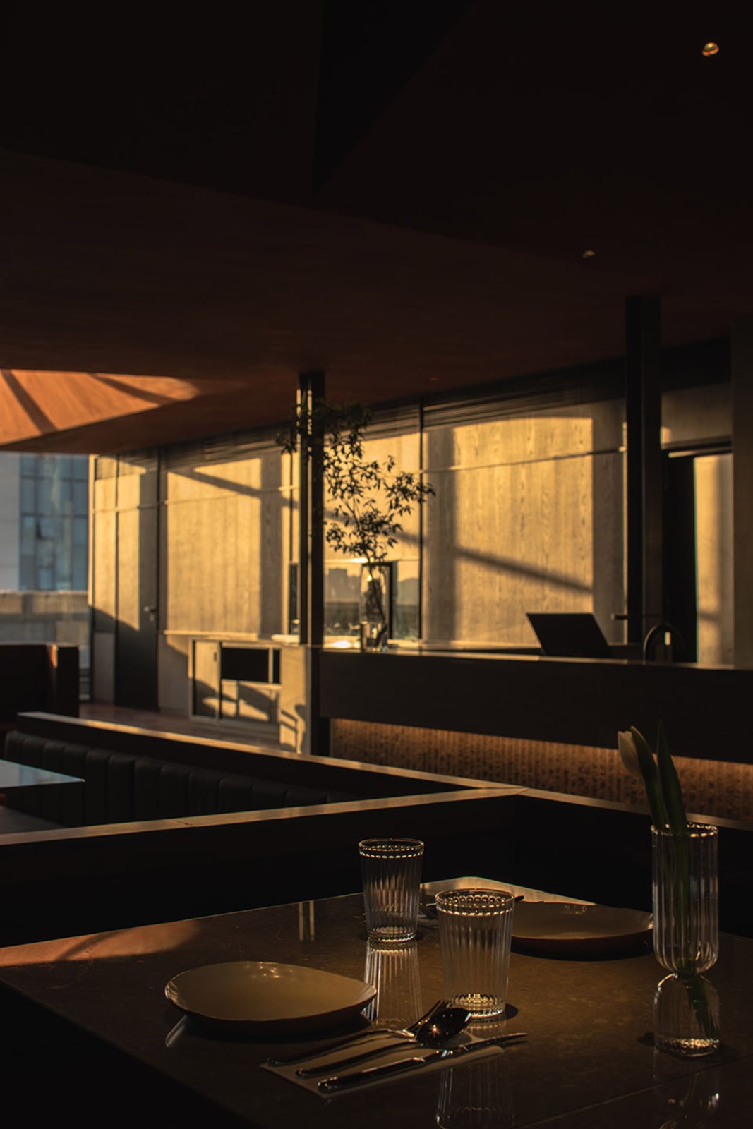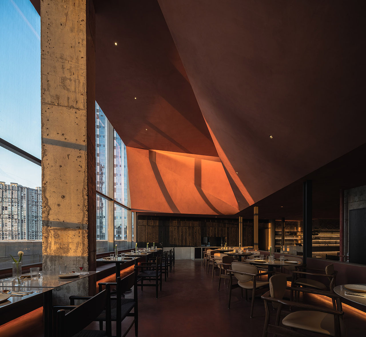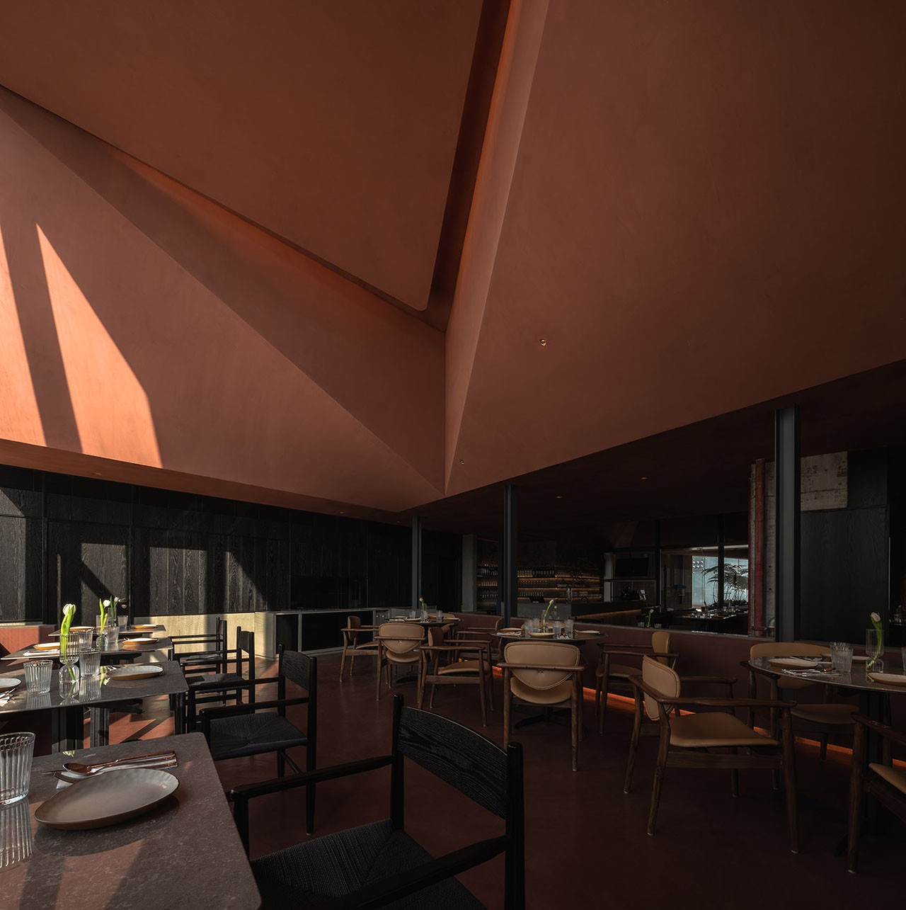 空间布局上并没有采用过多的分割空间与明切区分,餐厅内部的砖墙、混凝柱都被保留下来,融入整体设计之中。光滑的大理石桌面和墙壁上裸露的自然原石的肌理相互映衬,以简单的材质  提炼出深渊一般的时空感。
