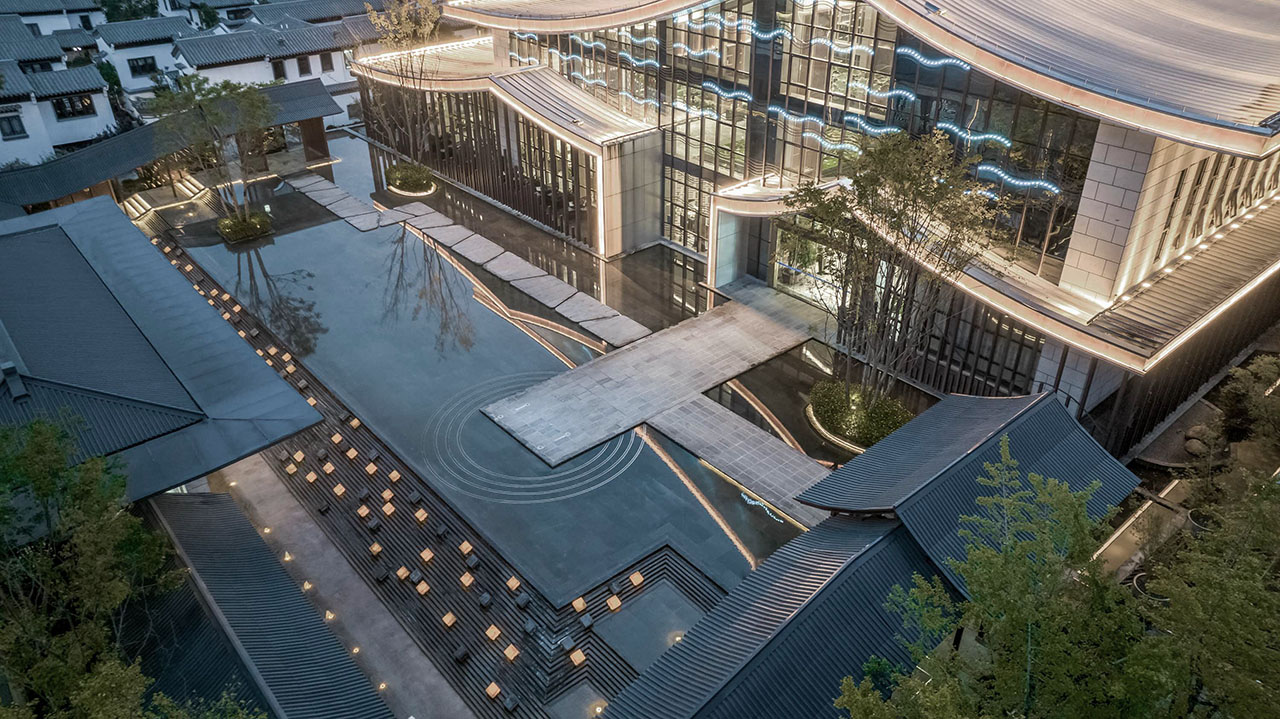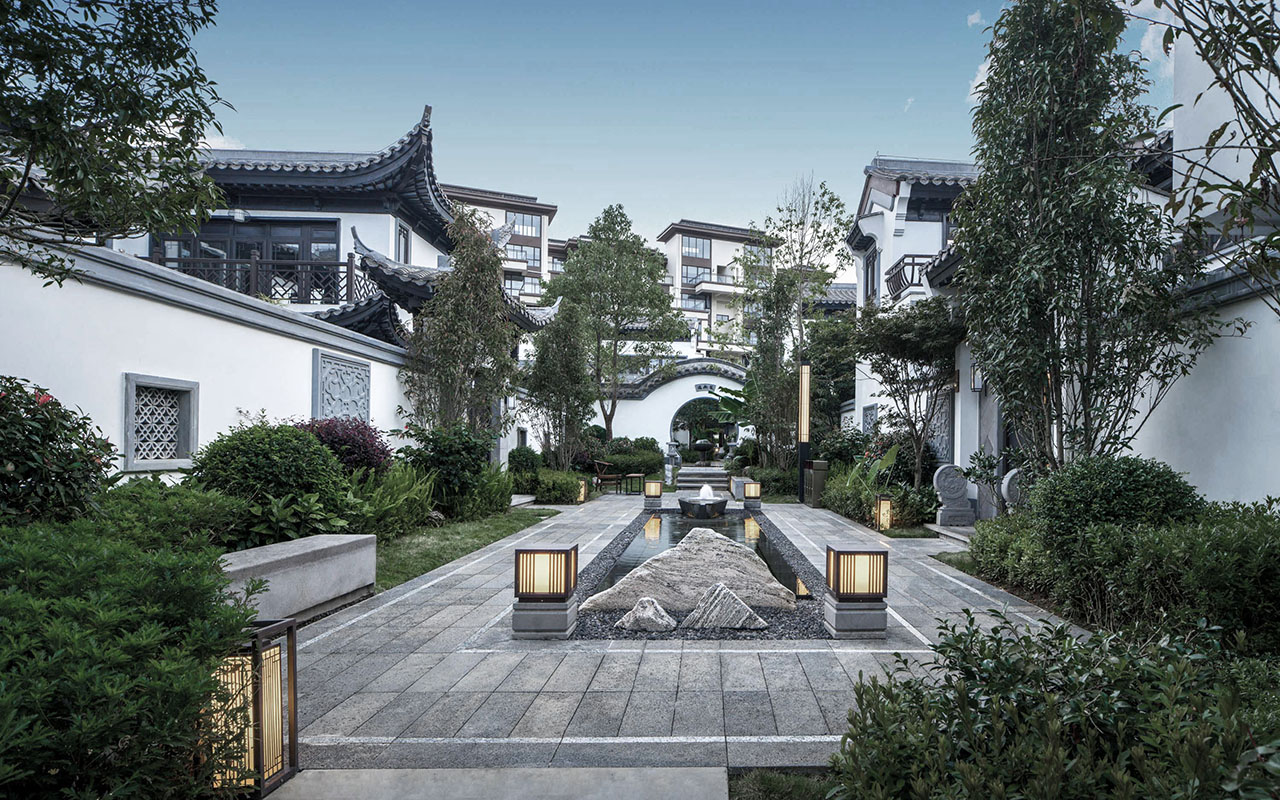 超大尺度的府门前庭,形成中轴对称的格局,低调奢华,尽显东方府门大气之意。通过“U”字形半围合空间,形成主入口形象空间,起到昭示和界定空间的作用,结合后场建筑,在夜晚也可轻易辨识。