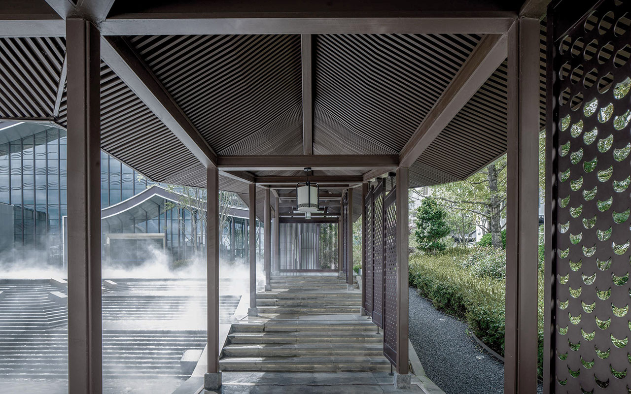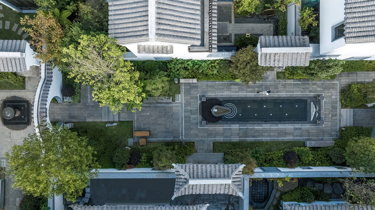 设计师利用地形高差,形成了层次丰富,温柔静水与潺潺叠水交相呼应的空间。静水中的三颗树池来源于古代园林模式中的“一池三山”,一池指太液池,三山指神话中东海里的蓬莱、方丈、瀛洲三座仙山,其寓意年年益寿,与自然和谐共处。
