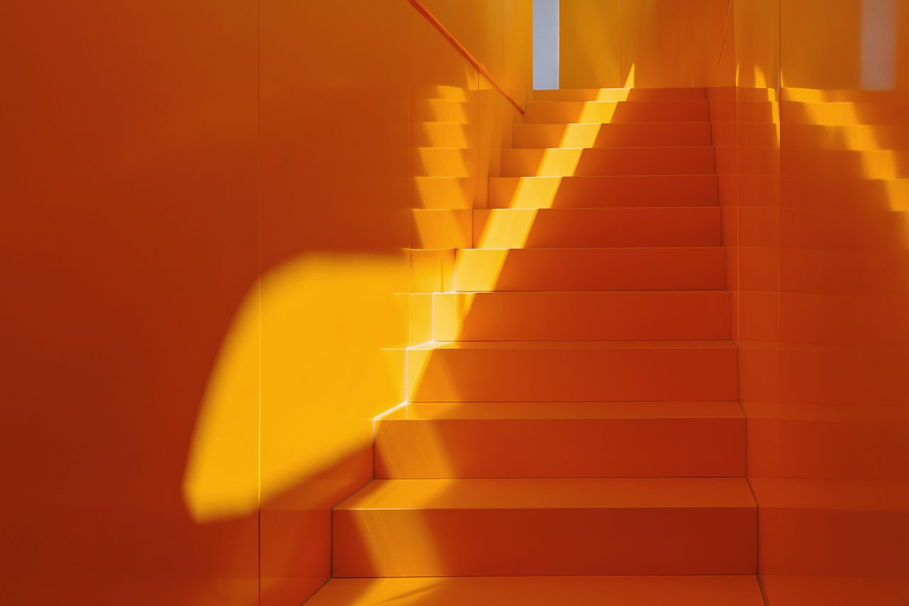 5 X 7 鹅所的室内空间的重新布局,借用了原建筑6.8米层高的特点,将室内划分为两层使用空间:在一层吧台区南面位置新增了橙色烤漆钢板楼梯,用以形成上下空间的连接,串联一层吧台区与二层茶歇空间的垂直路径.